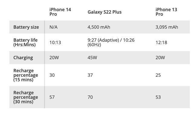 According to their initial test results, the iPhone 14 Pro is clocking in 2 hours short of what the 13Pro does in terms of battery life...