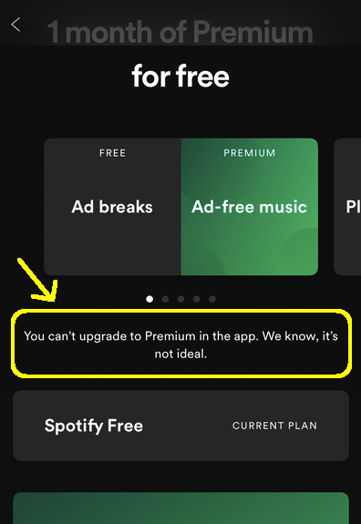 Technically Spotify is a company which main purpose is to earn money off others work.Right now, Apple wants to freeload off Spotify’s success… that’s why subscription via the app isn’t available.