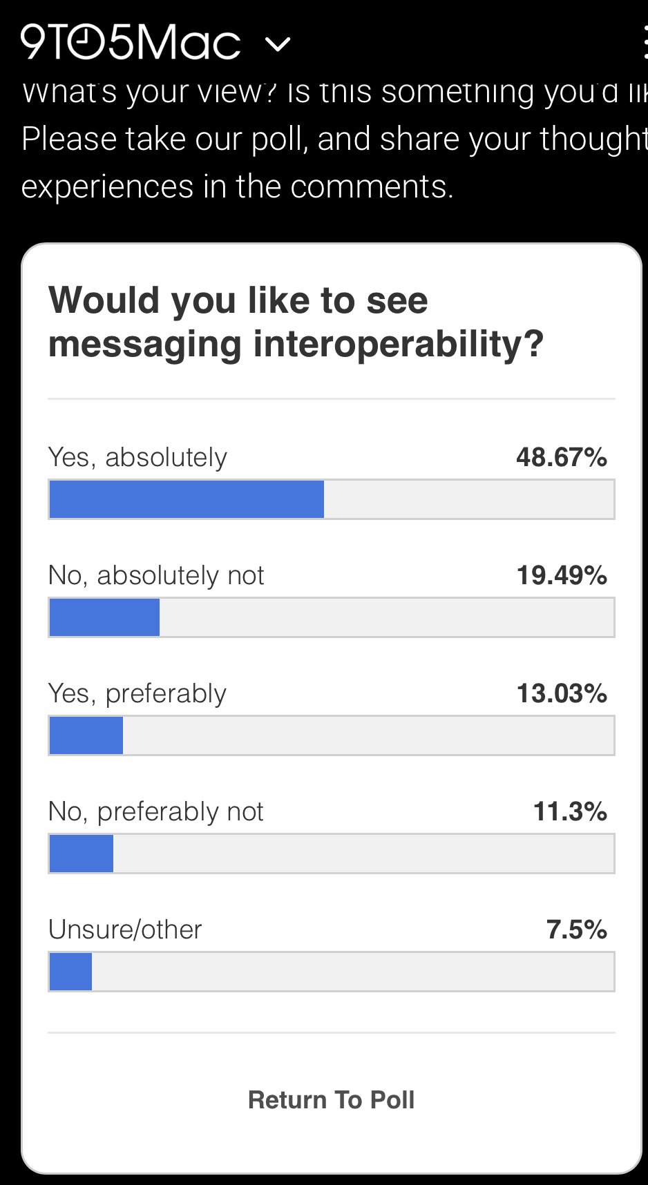 Forcing iMessage to be interoperable with WhatsApp, Facebook Messenger, Telegram, and hundreds of minor texting apps.... will equate to thousands of glitches and bugs every week. Absolutely stupid.