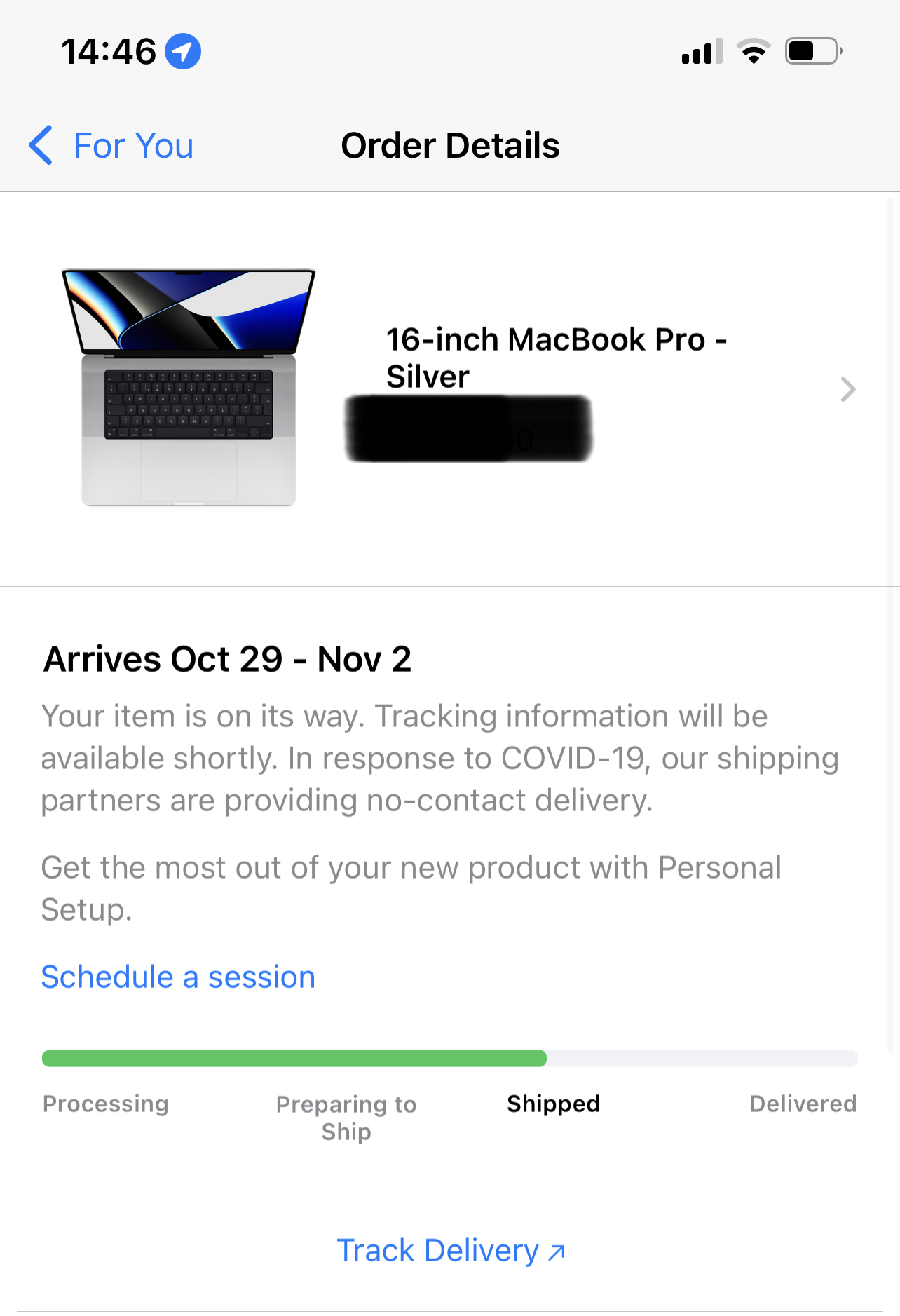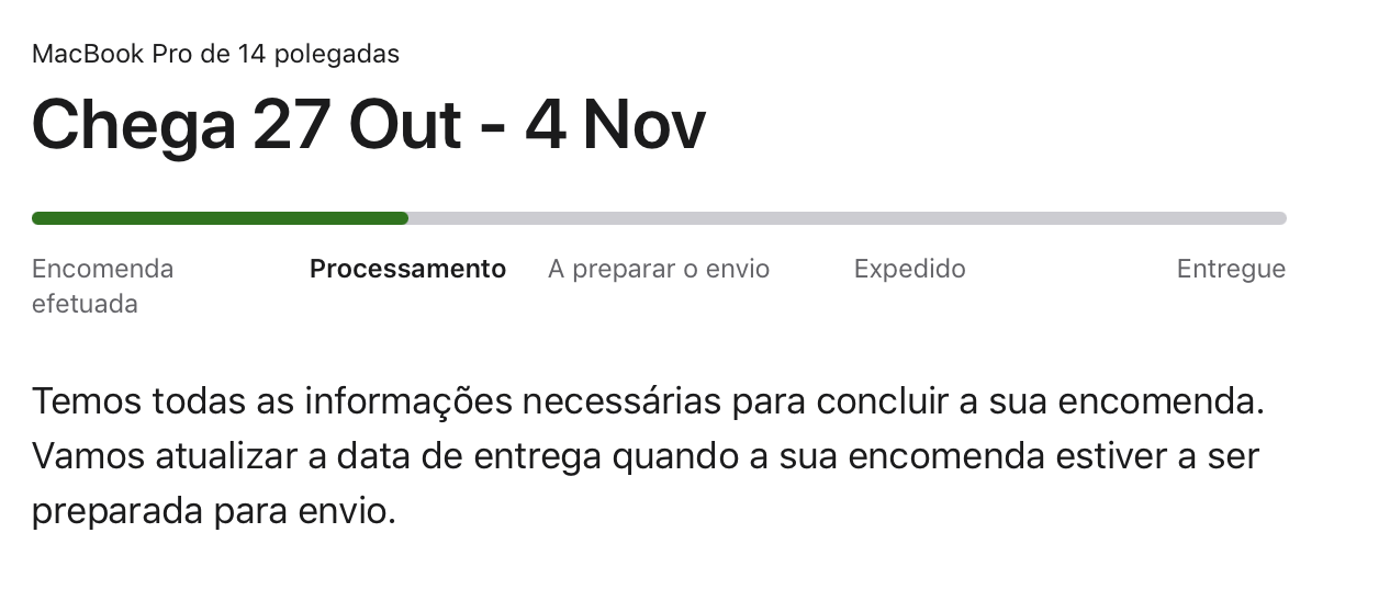 I just cancelled my order and got a new one for store pick up in 2 hoursSame for me, mbp 14 base model..