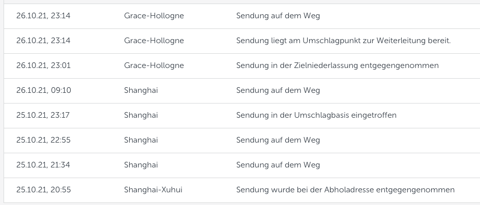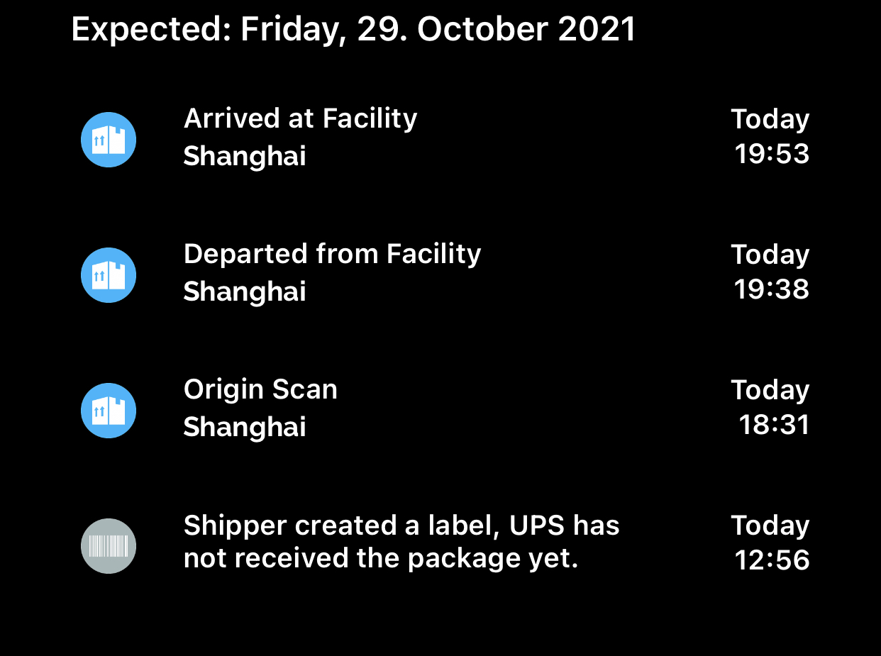 Says that on the website for me, but the UPS app draws a slightly different pictureIt says: 5:37 „shipped“ and then the next one: 7:54 „on the way“ both with Shanghai as location…