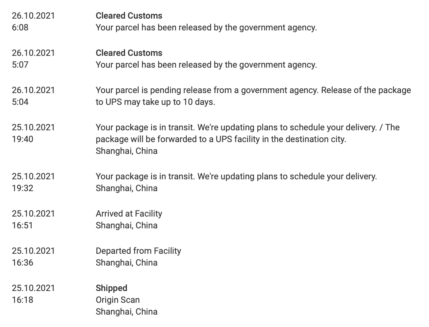 It says: 5:37 „shipped“ and then the next one: 7:54 „on the way“ both with Shanghai as location…Hey, could you tell me the exact wording on UPS's status? Did you get the departure scan? Or is it the in transit, customs cleared?