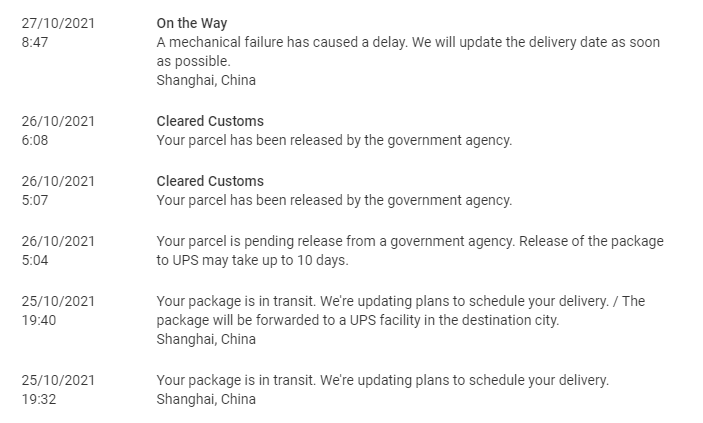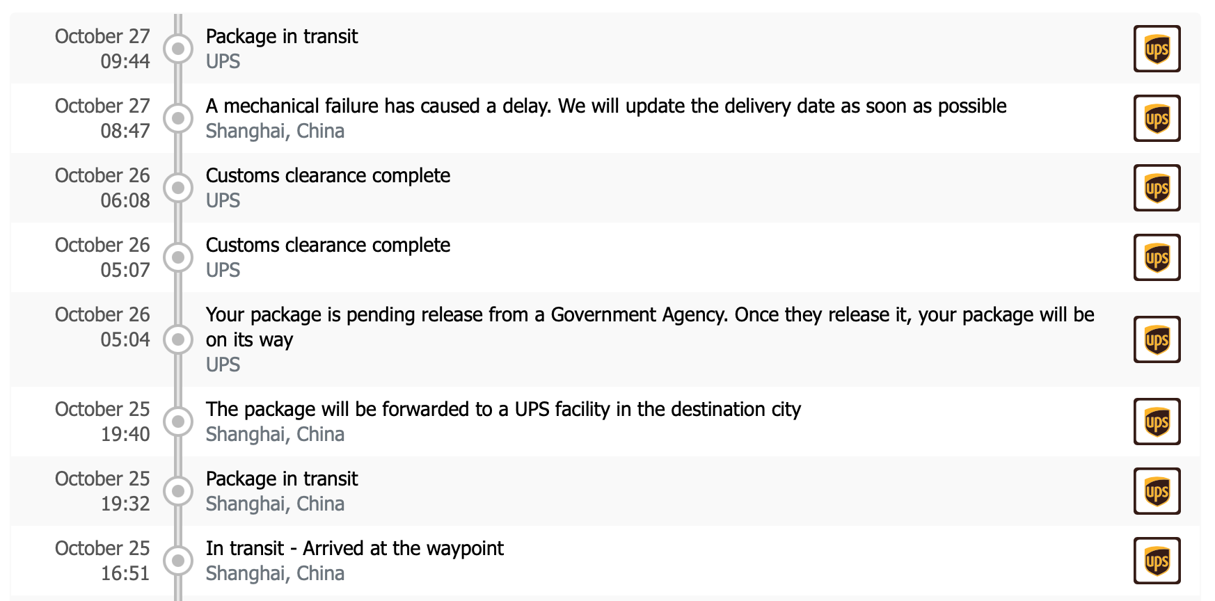 UPS on twitter: "That is correct, the package is still in China and will be moving today. Please keep tracking the package for further scans.", and when I asked to know when exactly it will move today I got this, "Unfortunately, we do not have that information in the system. Please keep tracking the package for further scans."