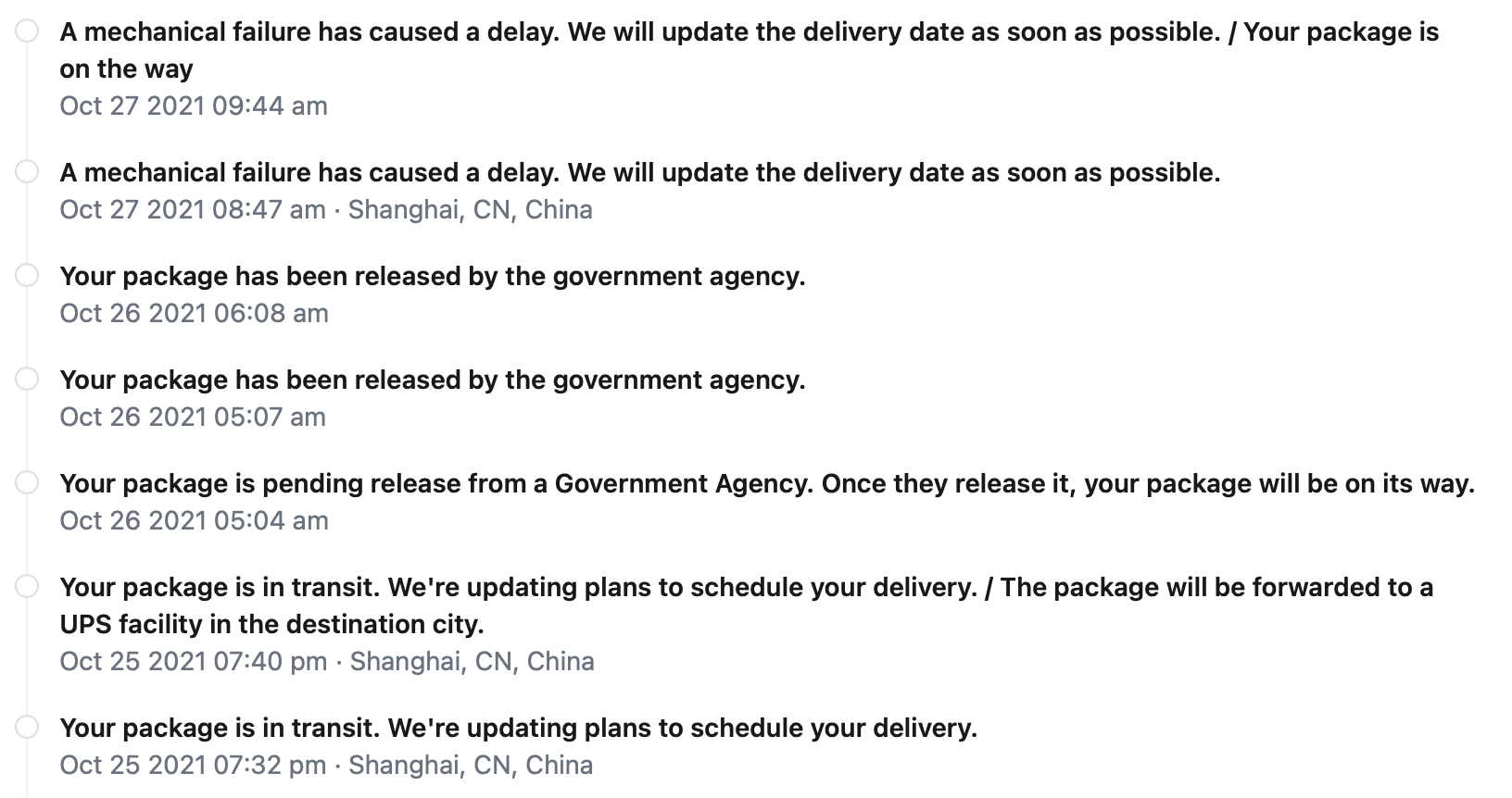 UPS on twitter: "That is correct, the package is still in China and will be moving today. Please keep tracking the package for further scans.", and when I asked to know when exactly it will move today I got this, "Unfortunately, we do not have that information in the system. Please keep tracking the package for further scans."