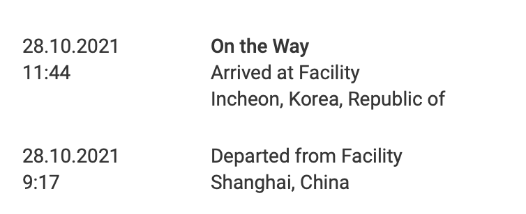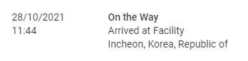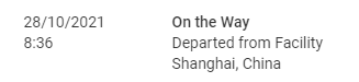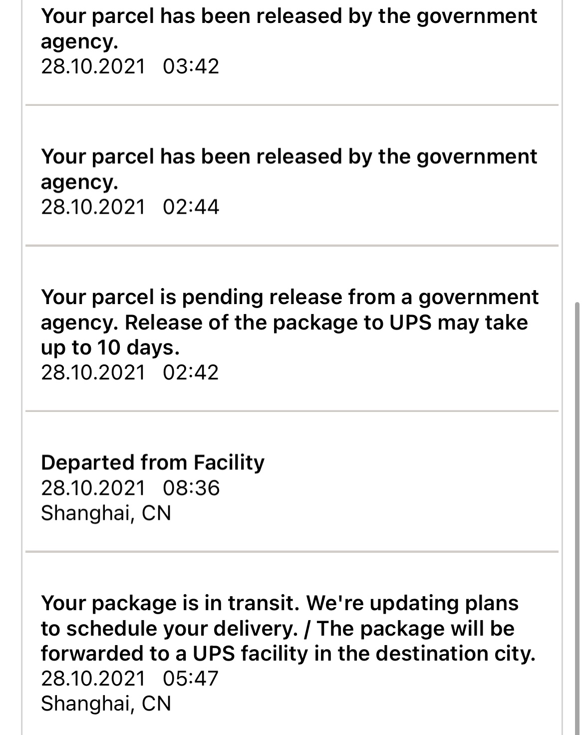 | 28/10/2021 5:47 | On the Way Your package is in transit. We're updating plans to schedule your delivery. / The package will be forwarded to a UPS facility in the destination city. Shanghai, China |