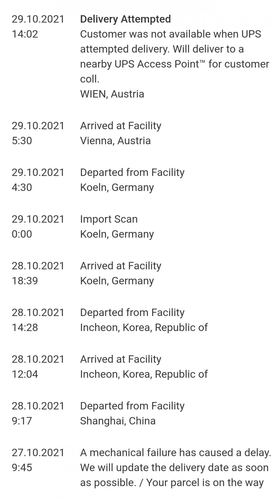 Yes same here. Mine was scanned at 18:19 as well. Guess they’re traveling on the same pallet until here! Mine doesn’t actually show any delivery date, but fingers crossed for Monday as well!Anyone else's shipment arrived at Cologne today? It was scanned there by UPS about half an hour ago. Unfortunately delivery still scheduled for Monday rather than tomorrow. Seems they could do it, but UPS doesn't deliver on Saturday usually.