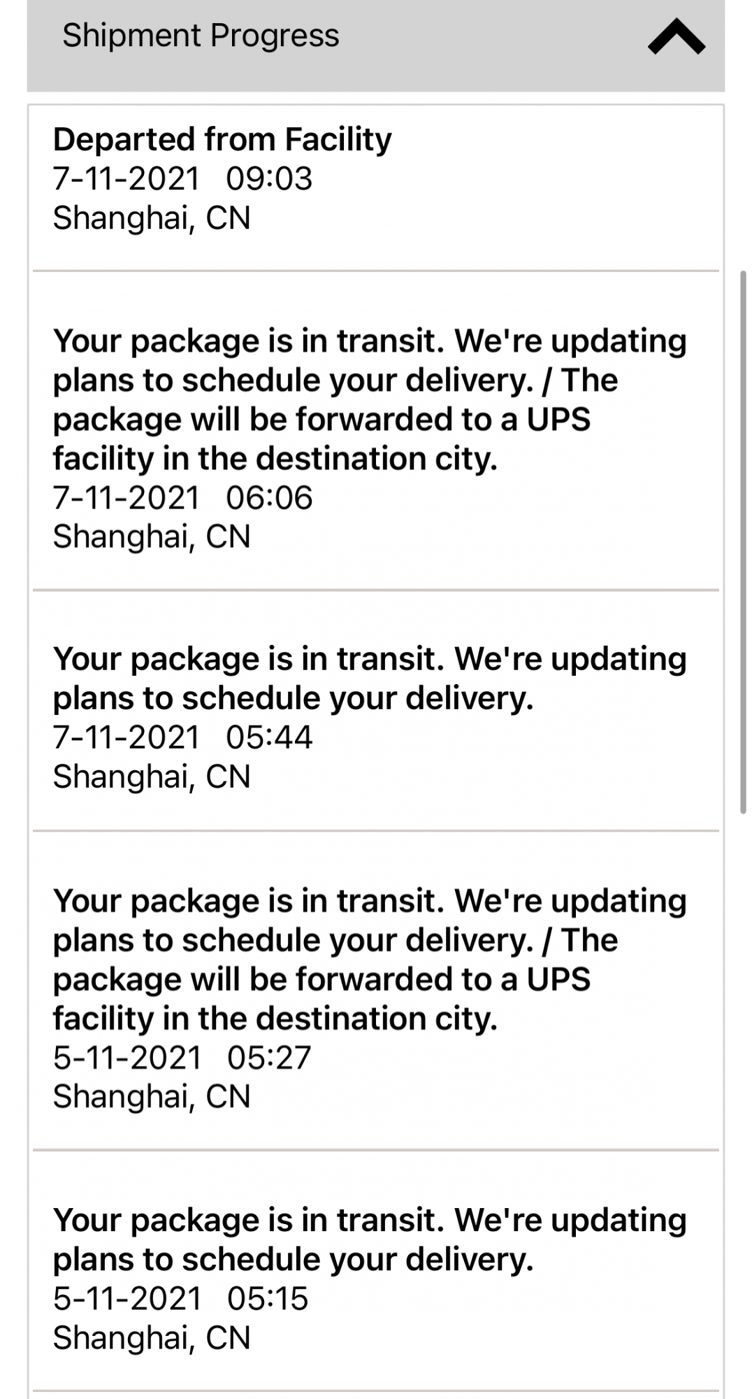 If you don’t mind, can you share your detailed UPS tracking? You can exclude last mile (your city).Oh man, sorry to hear that.Someone mentioned that UPS is short-staffed in China so maybe there is a bottleneck after clearing customs? Mine was not scanned or updated after the customs check until the shipment left Shanghai.