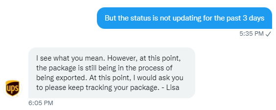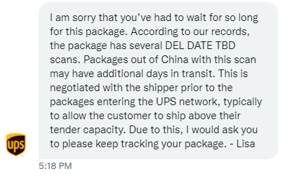 Your package is in transit. We're updating plans to schedule your delivery. / The package will be forwarded to a UPS facility in the destination city.