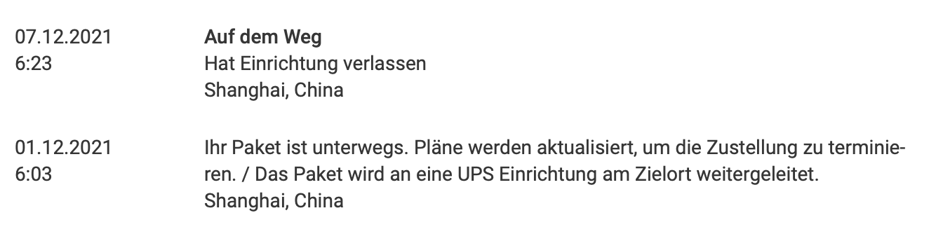 ... no update to UPS tracking, stuck on Shanghai with a timestamp of 29.11.2021 22:01