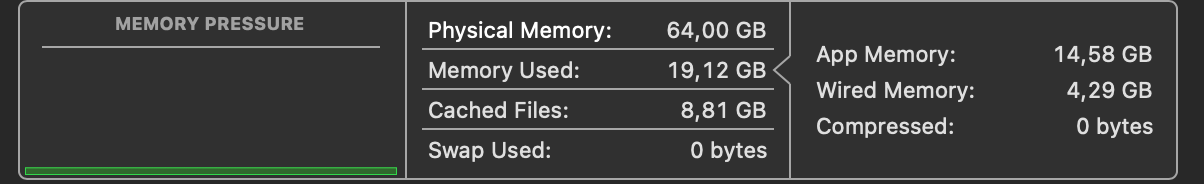 You have 64GB RAM and the system still uses Swap? This is super odd.I have 64 GB M1 Max MBP 16; it consistently shows 52-54 GB. No big deal; lot of is cache, and being ready. I rarely see Apps slow down or Memory pressure in Red or yellow. Let OS handle the memory, and enjoy your Mac unless you have a reason to worry.View attachment 2351252