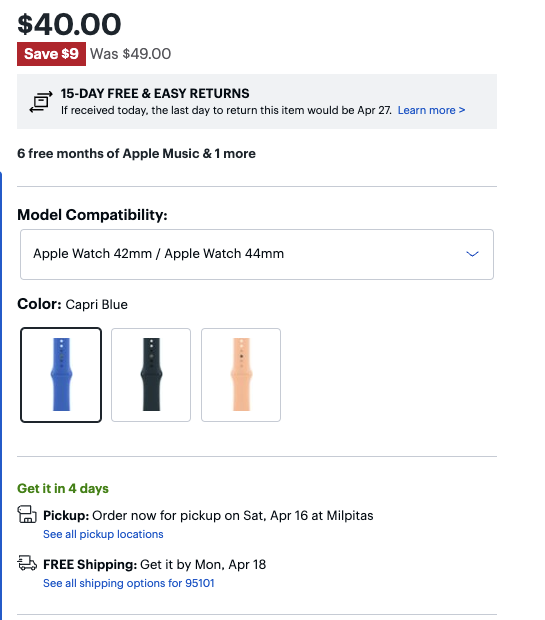 I checked that link and the only thing I see is new for $44 (38-40mm).In case you want to buyBest buy has open box for 34$ (https://www.bestbuy.com/site/sport-...m-and-44mm-capri-blue/6334557.p?skuId=6334557)