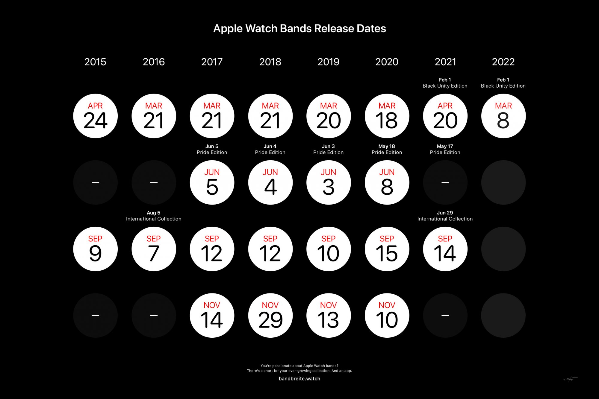 I might be a little late to the party (and some of you may know this), but here’s an updated release dates chart. I hope it helps. I fully agree with @athousandbands, and still have my fingers crossed for a Summer collection after Pride bands. Apple might have skipped the season last year, but maybe it was related to the International Collection of Sport Loops.Pride band(s) May, next seasonal collection September event