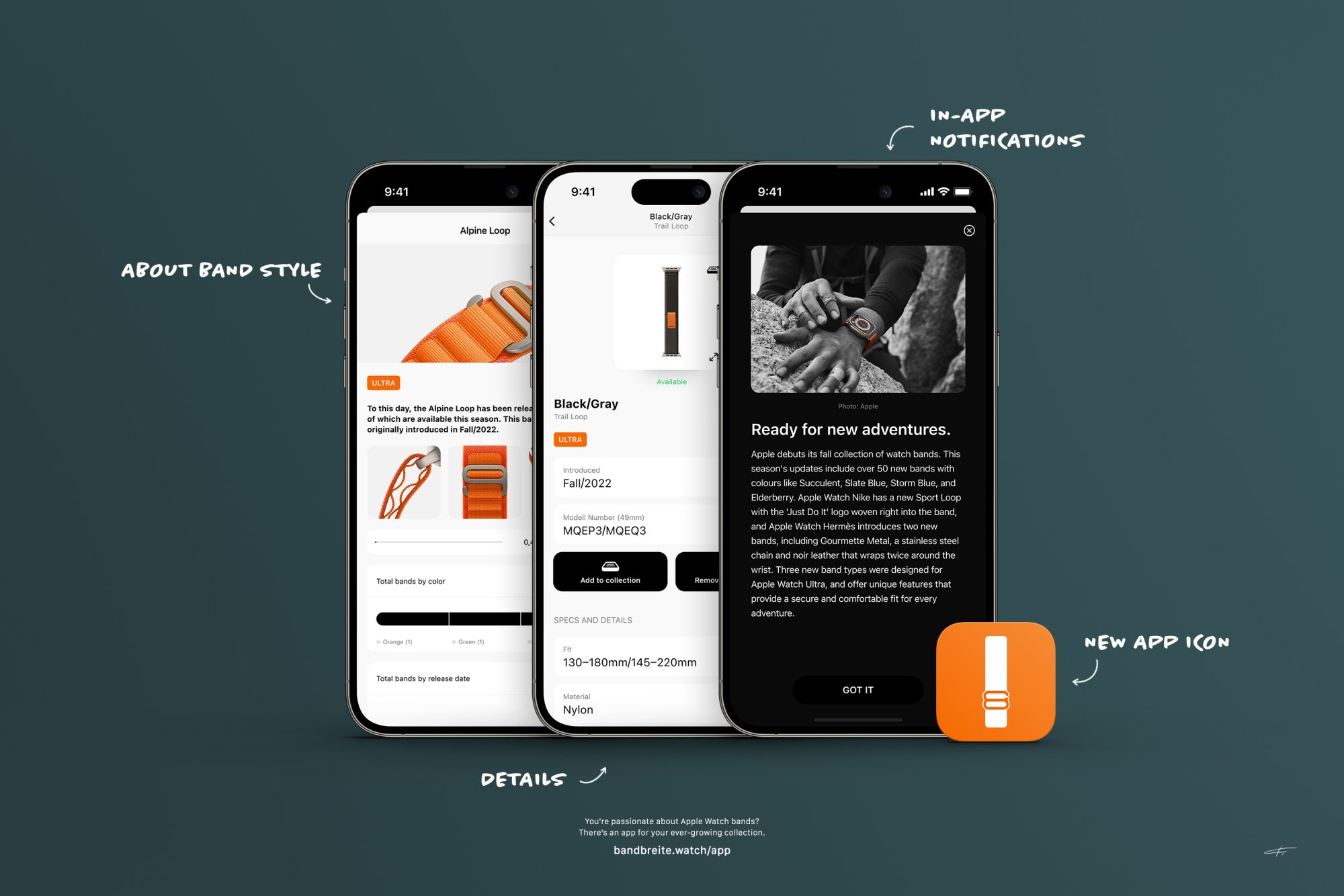 What's new in 1.5? We made the app you love even lovelier! * The app has been updated to support the all-new band types for Apple Watch Ultra, with adjustments on band details and band information. * With our new in-app notifications you will never miss new bands, new collections or any other important updates. * The popular recommendations from our widget are now additionally available within the app. * We're celebrating the new Apple Watch Ultra with new gorgeous app icons and stickers for messages. * We tweaked the design, improved the UI, and fixed some bugs to make the app and your experience even smoother—not only because we support ProMotion now.
