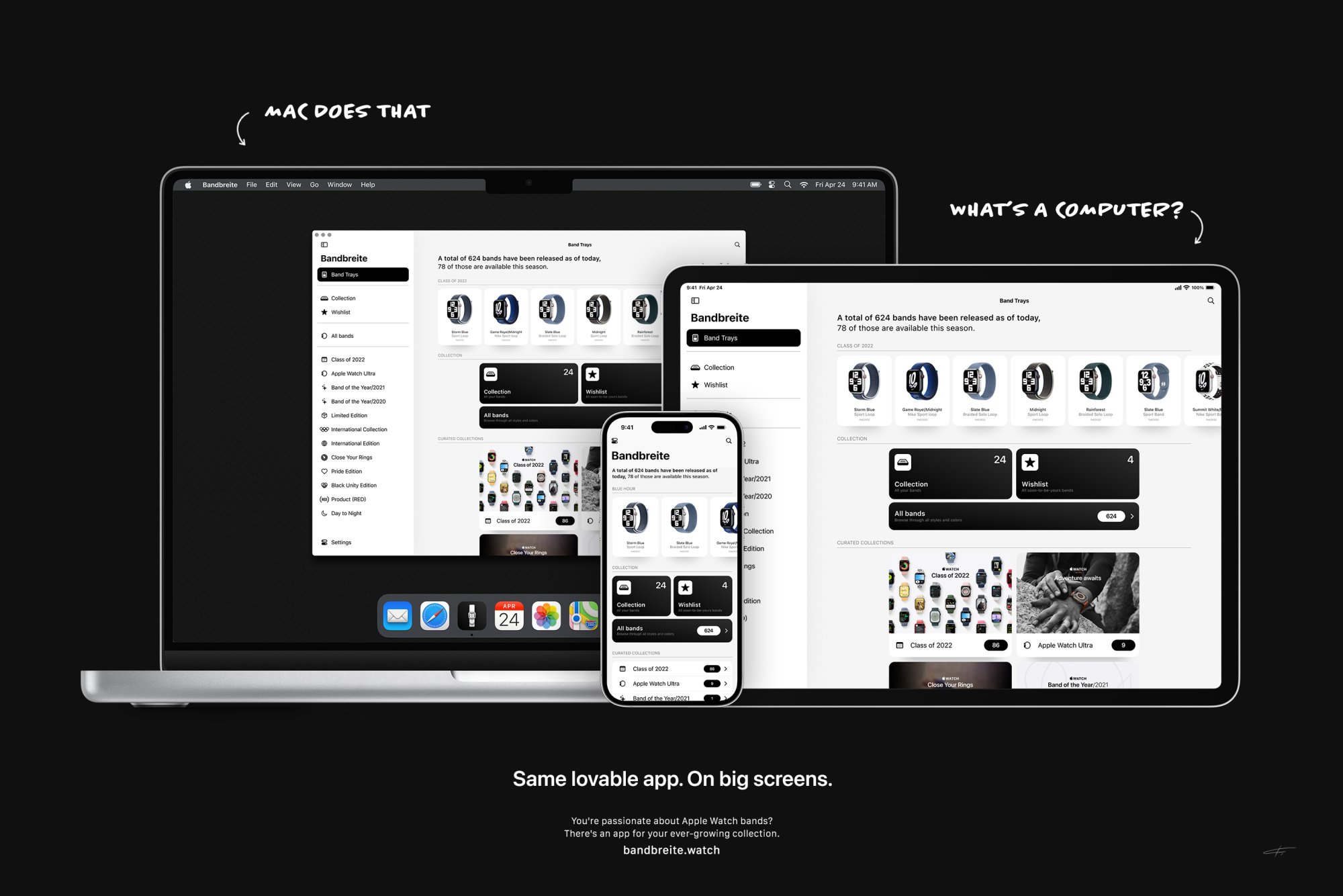 Instant download!The same lovable app, on big screens. Still free. "Bandbreite", your favourite app for your ever-growing watch band collection, is available for macOS starting today! | http://apple.co/3cEElZg #AppleWatchBands #BandbreiteApp