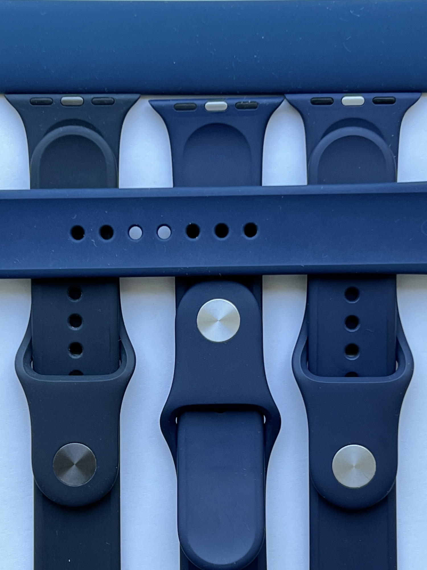 For reference, the band on top is an Abyss Blue solo loop, the band in question is the one in the middle, with the mismatched longer piece laying across. According to the markings it is genuine Apple.