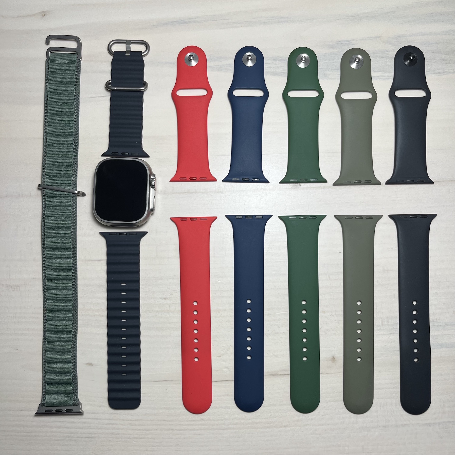My small collection, all the bands are genuine Apple bands. The AW Sport band colors are: red, abyss blue, clover, khaki, black. Green alpine loop and Ocean midnight blue band.