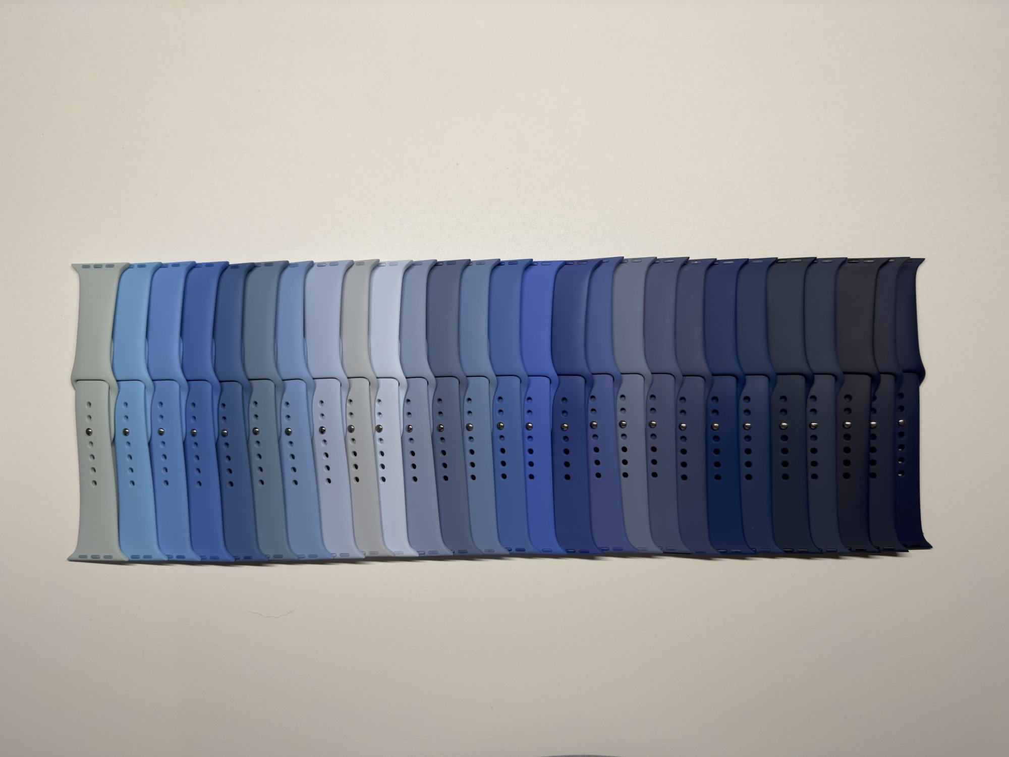 Here is all 27 blue sport bands. Order is below and per Bandbriete. Had to shrink the image down a lot, but the colors look as good as I could get them in the lighting I had.