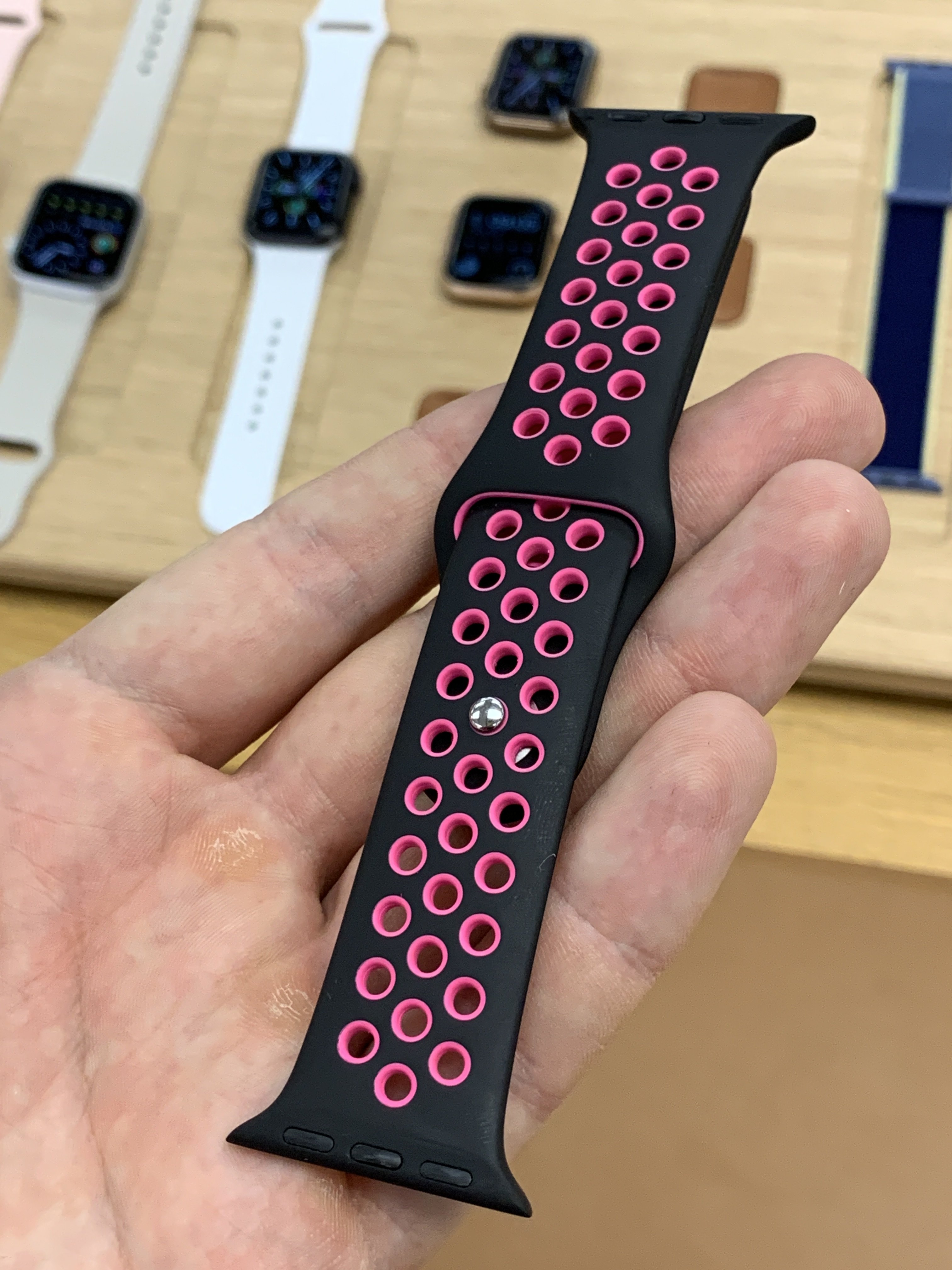 Pine green is lighter than I hoped. I don’t know why Apple has such a problem with creating a legit dark green or a dark red sport band. It’s been five years and we keep getting bright greens or bright reddish pinks. Hey Apple, not everyone lives in sunny California. It might be nice for some dark band colors (Brown? Orange? Purple?) so those of us in the Midwest can have watch bands that better match the season.