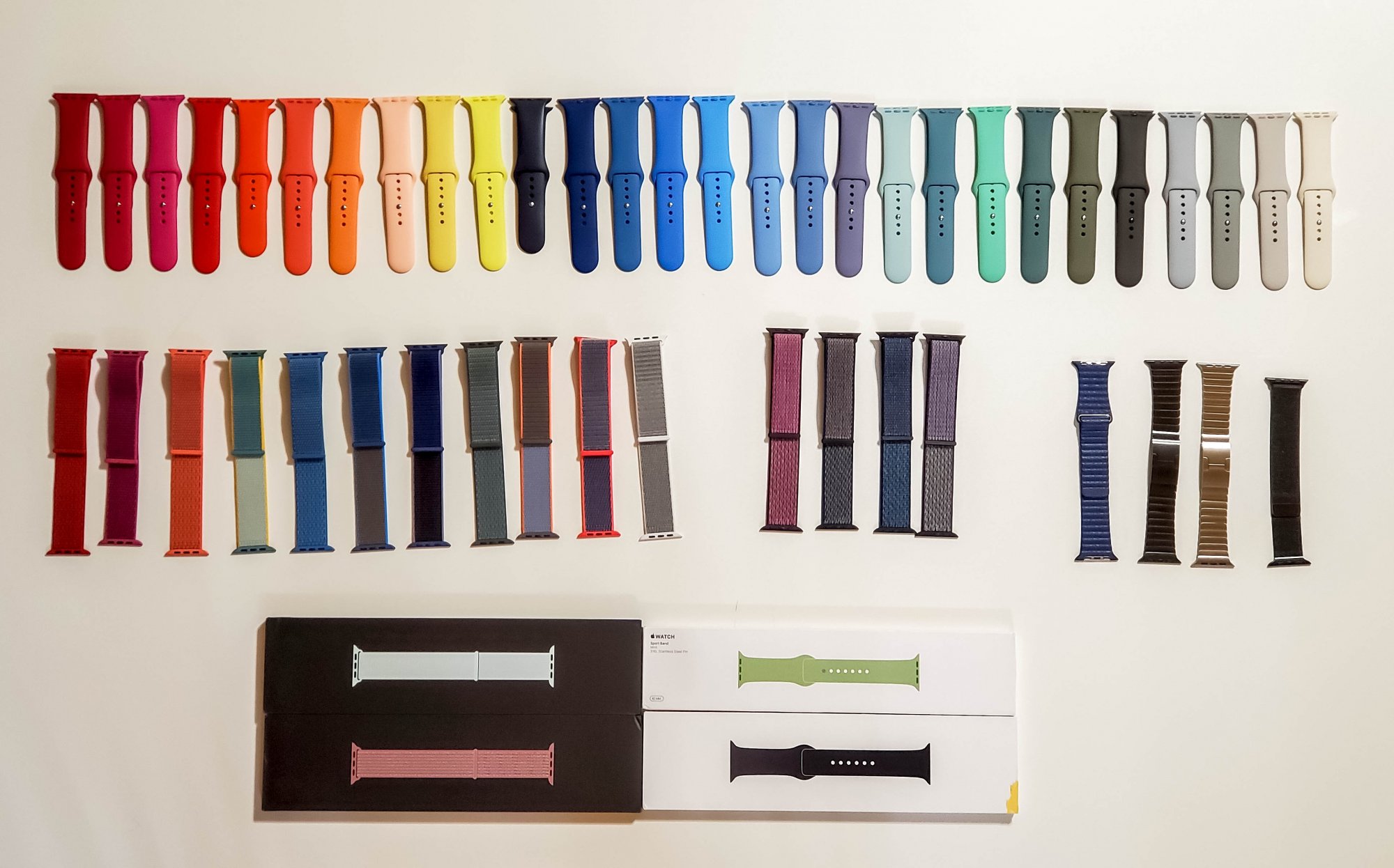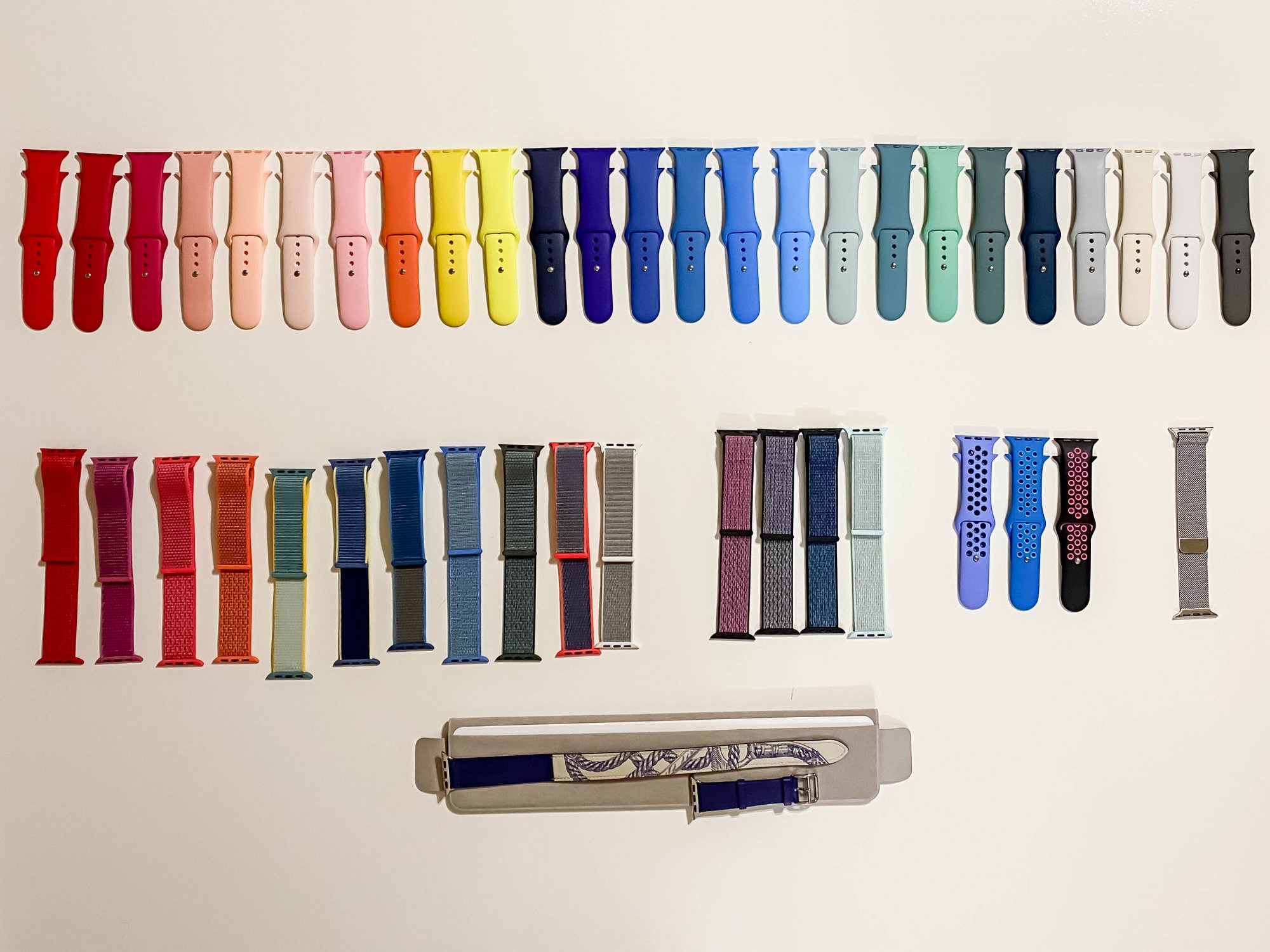 Look at that beautiful rainbow!My small collection, still missing ultraviolet and azure, which are en route. From left to right, white, stone, pink sand (current gen), grapefruit, pomegranate, product red (current gen), papaya, pollen, khaki, pine green, surf blue, delft blue, lavender gray, and black (current gen):