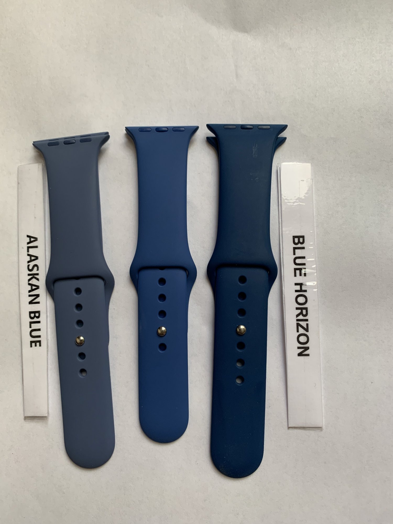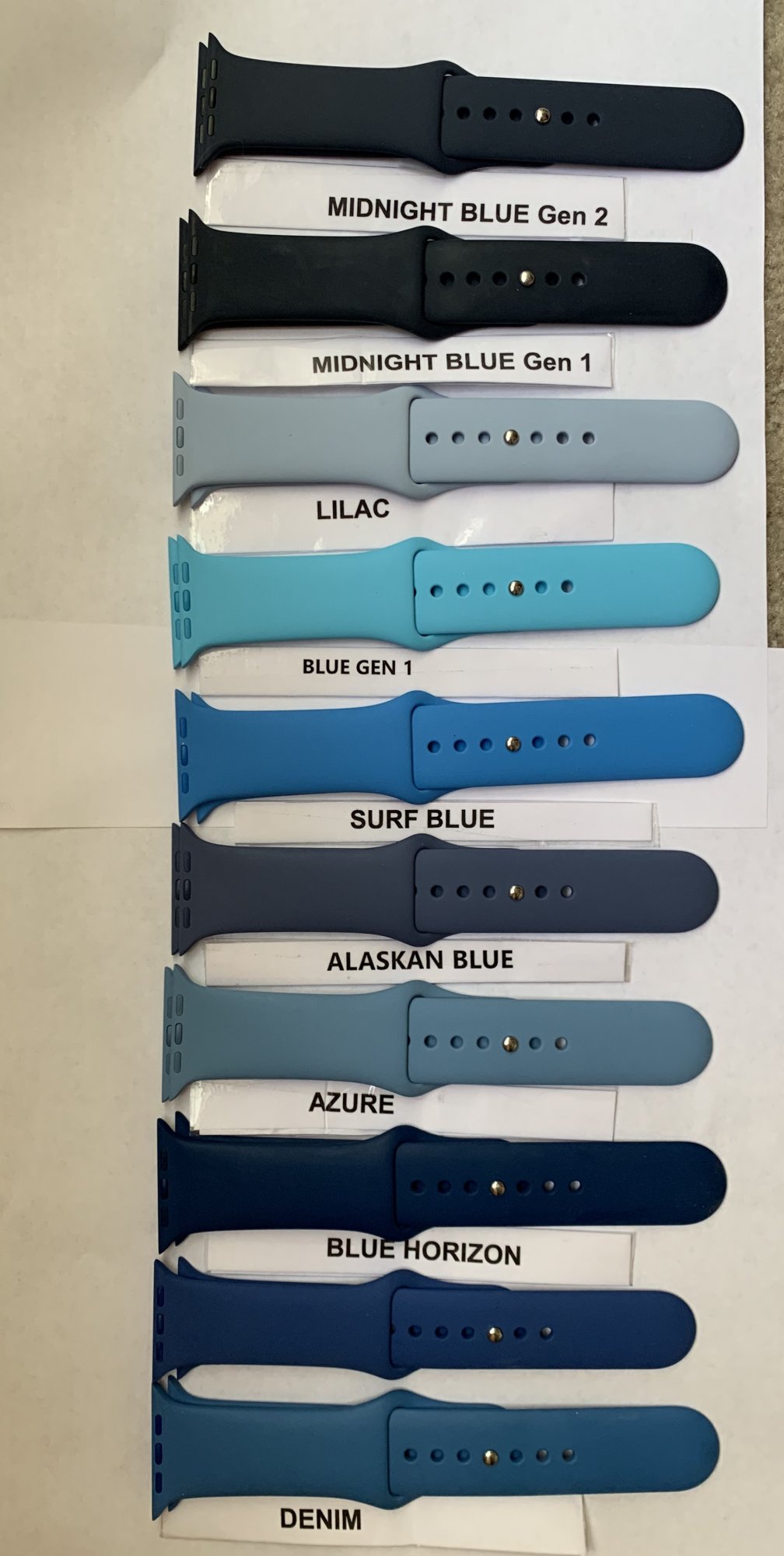 My guess is Ocean Blue. Here’s my comparison (Horizon, Ocean, Denim)My next question is.... Two of the four bands I just scored, do not have the markings on the part that slides into the watch. They feel real, they have all the other markings.