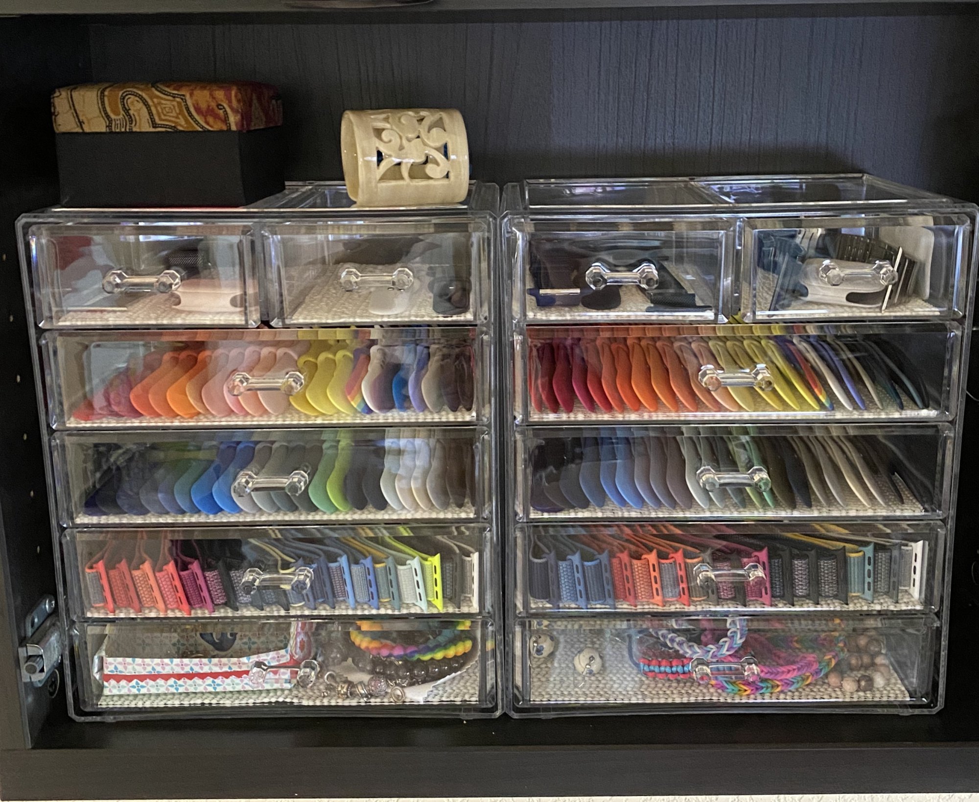 also, just for fun, here's a photo of our current storage system, inspired by all of you who have the same case. Hers on the left, mine on the right: