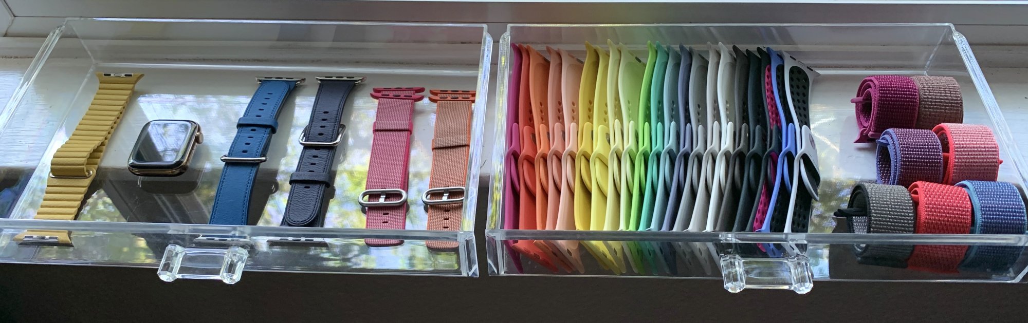 Missing were: Azure, Vintage Rose, Midnight Blue, and Silver Milanese Loop. Sold because I knew I wouldn’t wear them enough, wanted money for different ones 😉 I’m pretty determined to keep mostly the bright colors in my collection, and phase out the darker ones. Also, I guess I left my nectarine loop somewhere else... must find!