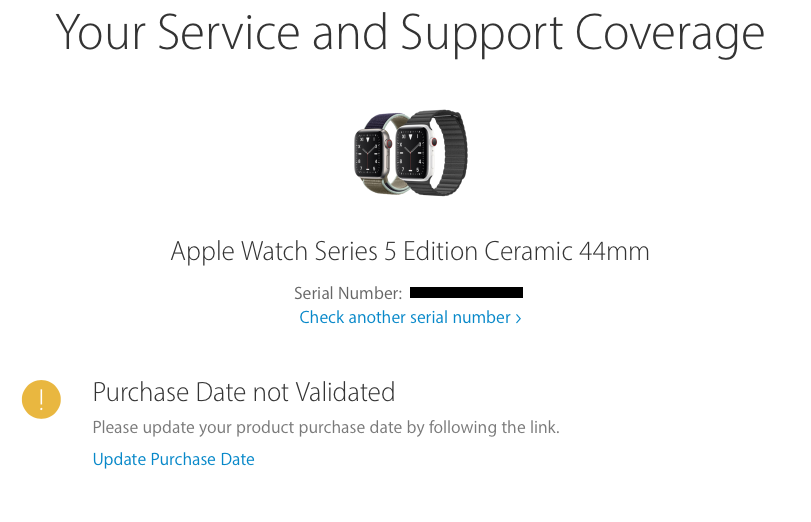 I'm trying to check the warranty status and the Serial Number checks out here: https://checkcoverage.apple.com but it's asking me to update the purchase date and isn't accepting any of the dates I type in. Any suggestions aside from calling Apple? I'm presuming this would still be covered by the original 2 year warranty, but since I bought it refurbished from a third party on eBay, who knows...