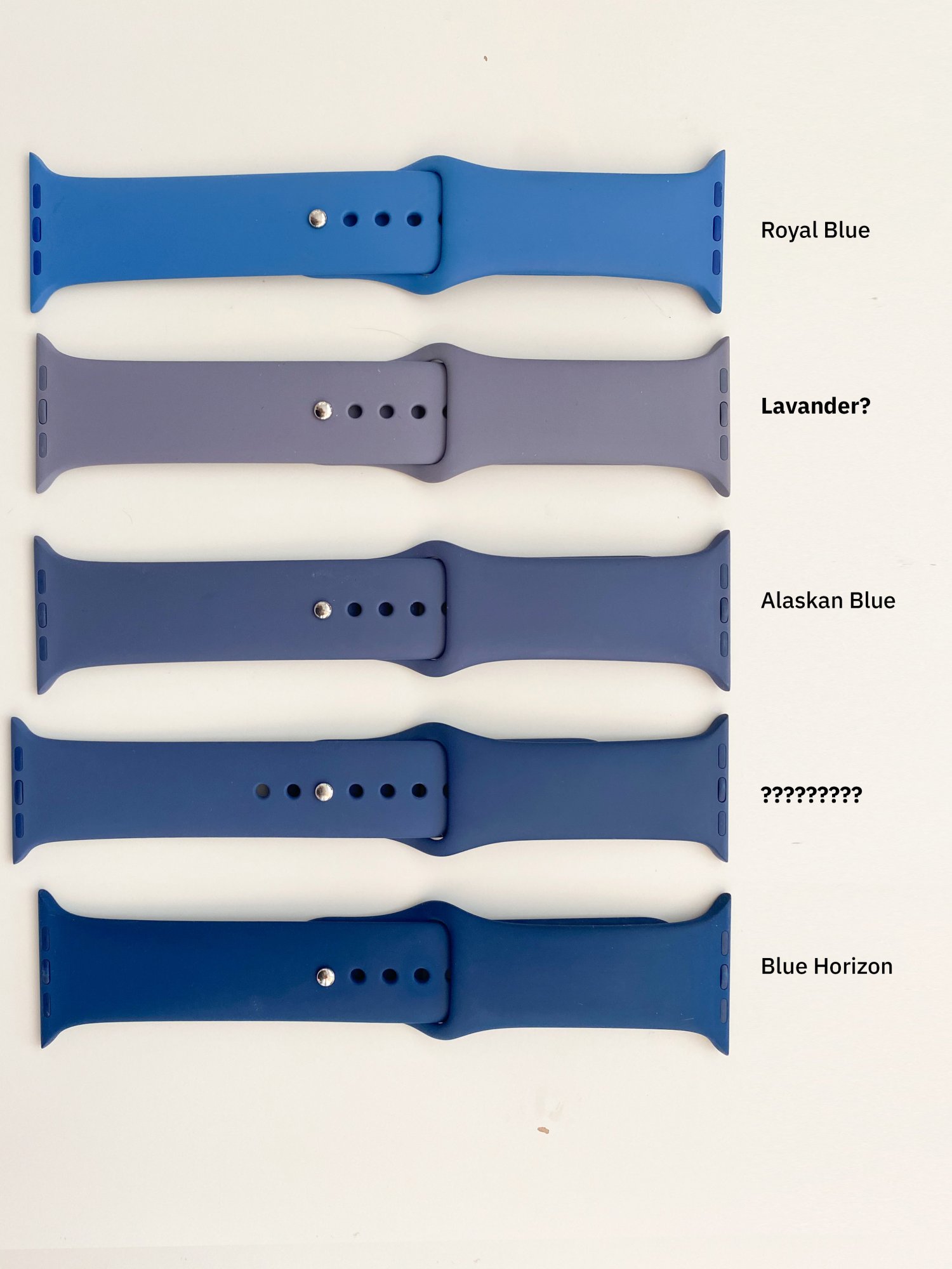 The one you labeled as Lavender is Lavender Gray for sure, the other one appears to be Denim Blue or Ocean Blue.Hi guys, I need some help 😖. I bought 2 bands without box and I'm having a hard time finding the color name.