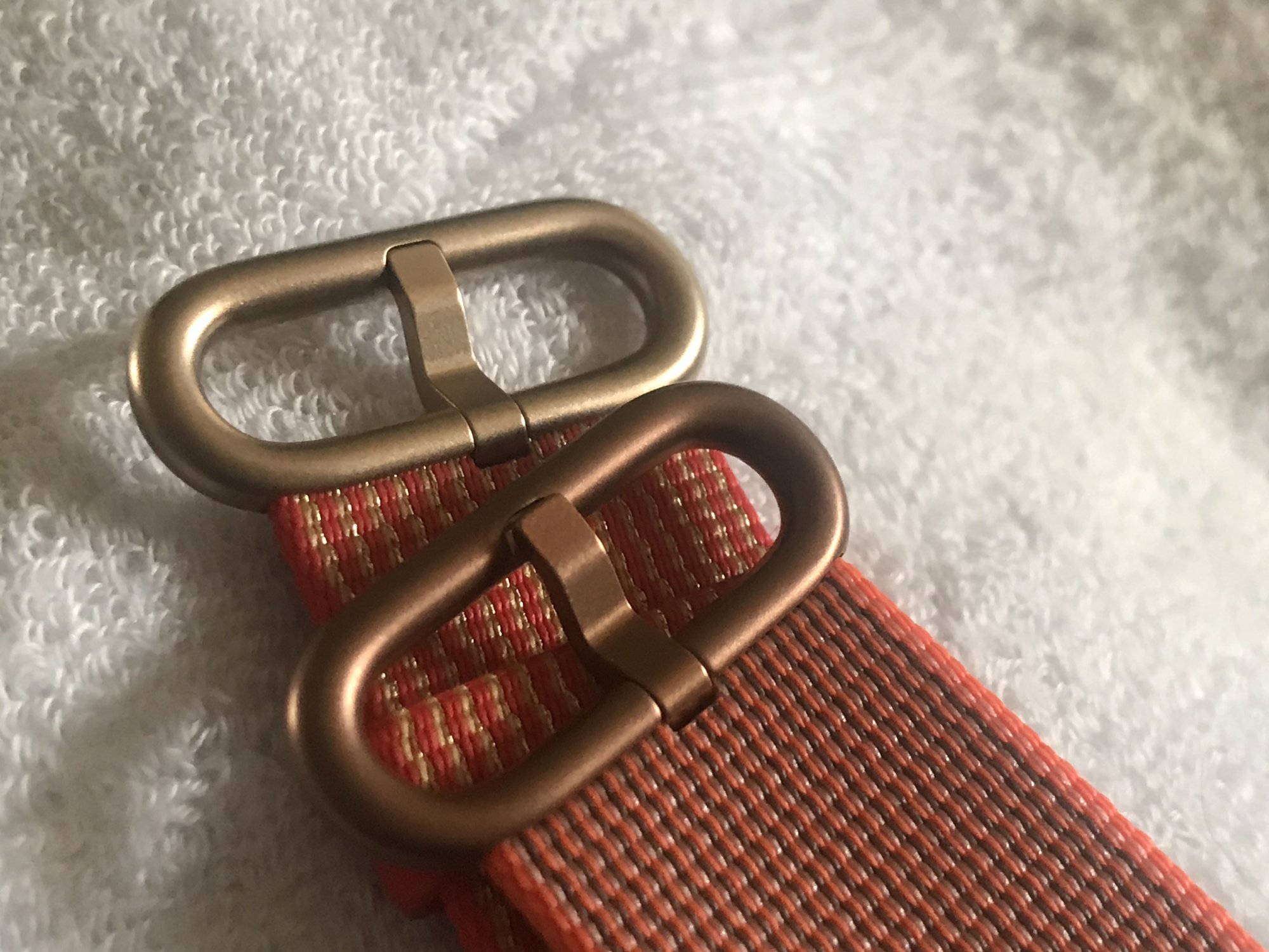 so, I have a 42mm Space Orange/Anthracite Woven Nylon (The Anthracite on this band is actually a dark blueish gray!) but by chance, mine has a gold buckle.