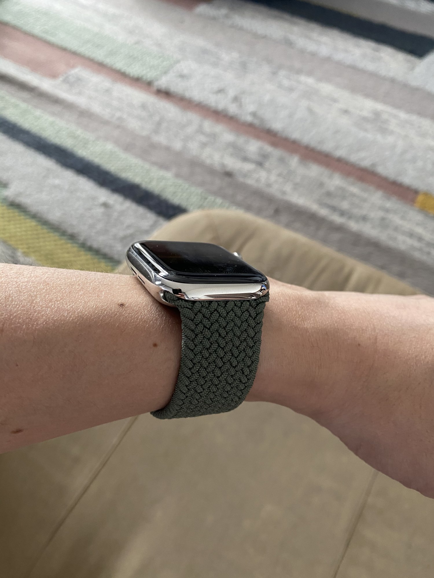 It looks like it fits comfortably. I tried one in store, 5 felt right, 4 started to feel tight and noticeable. I have a 5 coming Monday!Inverness green braided loop. Feels very comfortable. But I can’t tell if a size 5 is too big for me. Does your solo loop slide up and down your wrist and you raise and put down your arm?