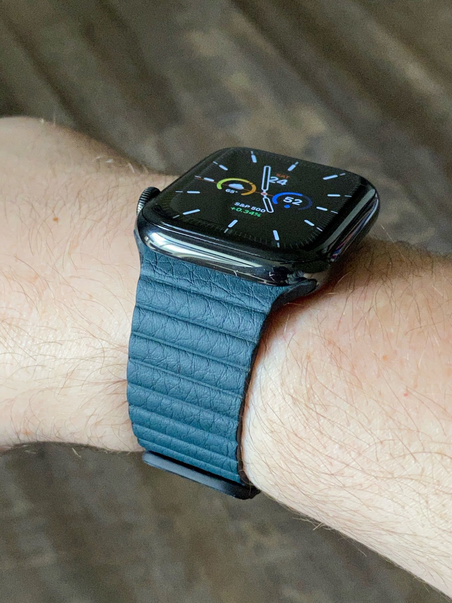 Cloudy day here so not much chance for good pictures of the Forest Green and Midnight Blue leather loops I picked up from the Best Buy sale. Both colors are nice but maybe a bit muted for the space black watch. They look a bit more vibrant in these pictures than they do in person. I think Bright Blue probably looks better than Midnight Blue with the SB watch as it gives a bit more contrast.