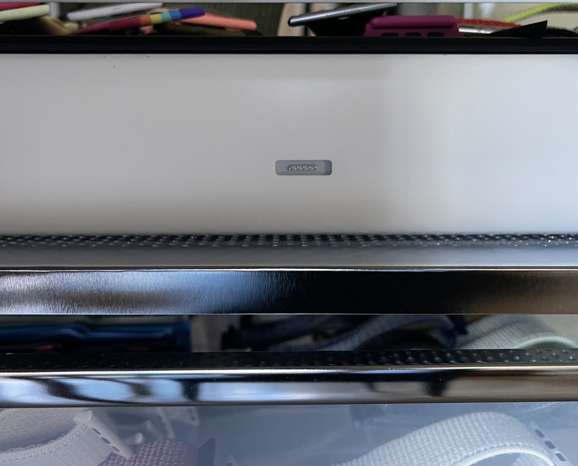 Ah, does it hide behind a cap or something? I swear I didn’t see it on your other shots.MagSafe 2. I was gonna plug it in and make them all light up but I don’t have an outlet near good lighting and c’mon when does Apple put cables in the hero shot.