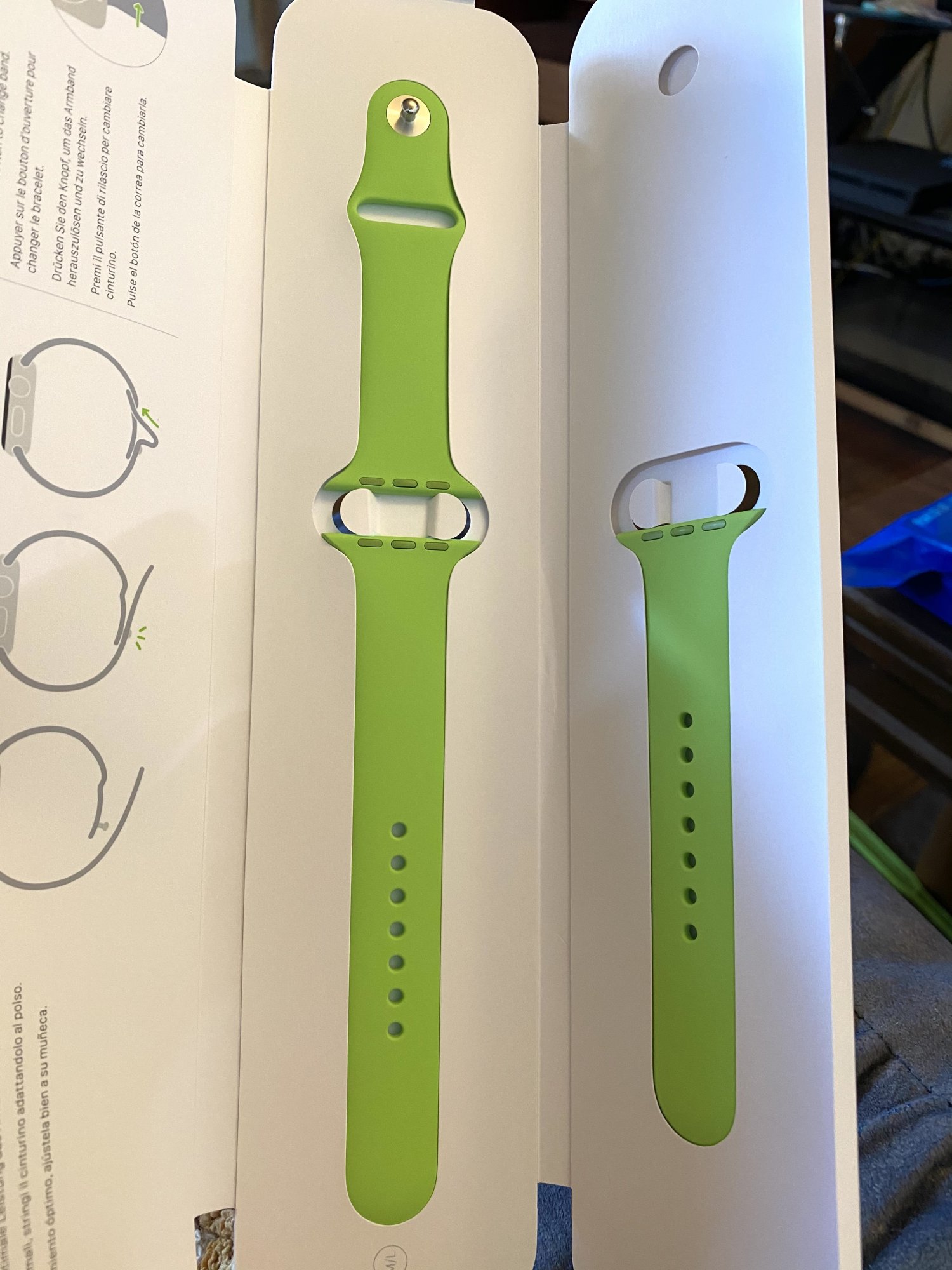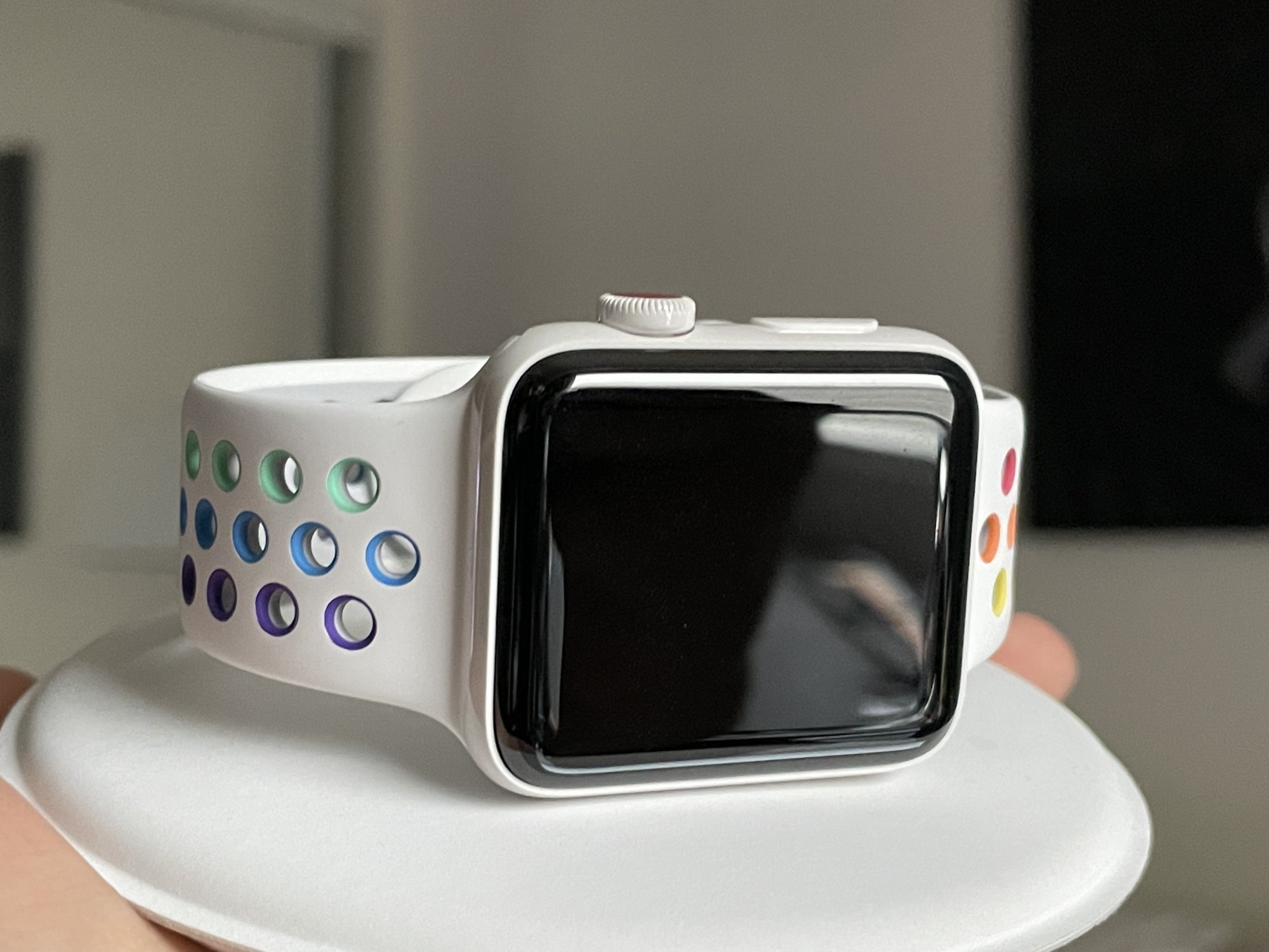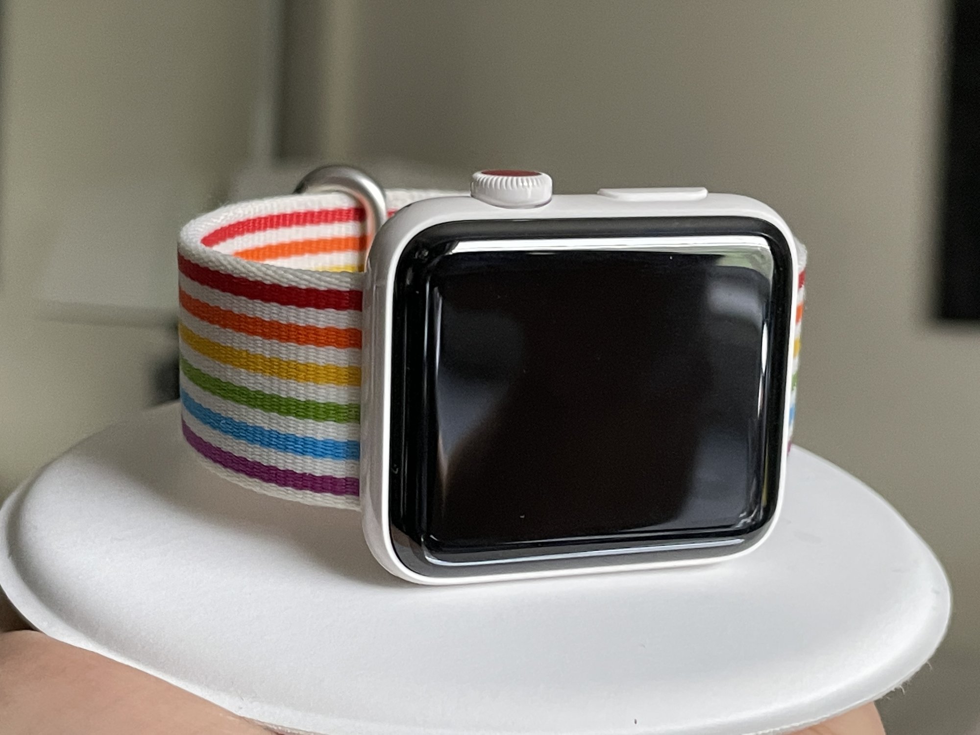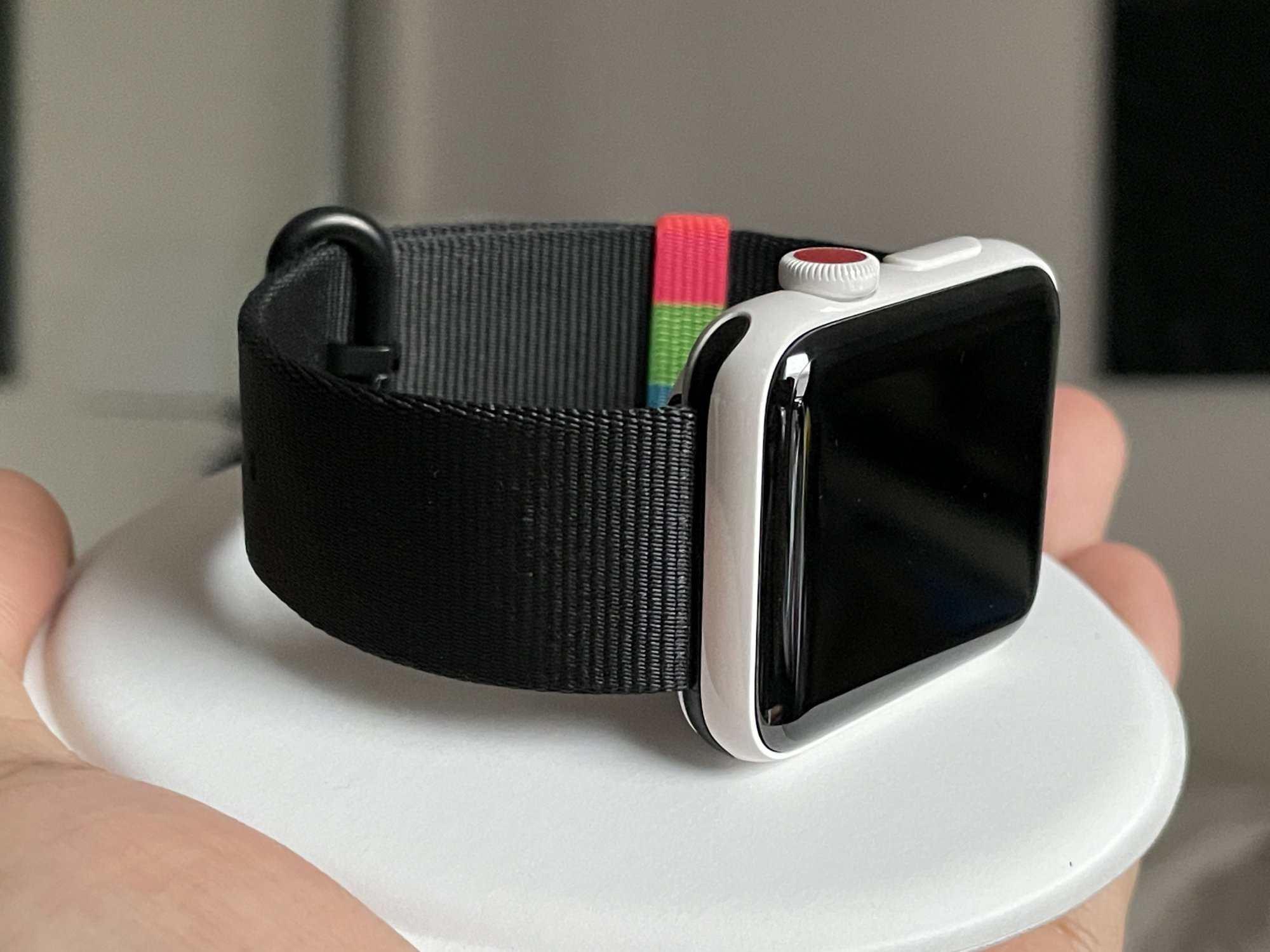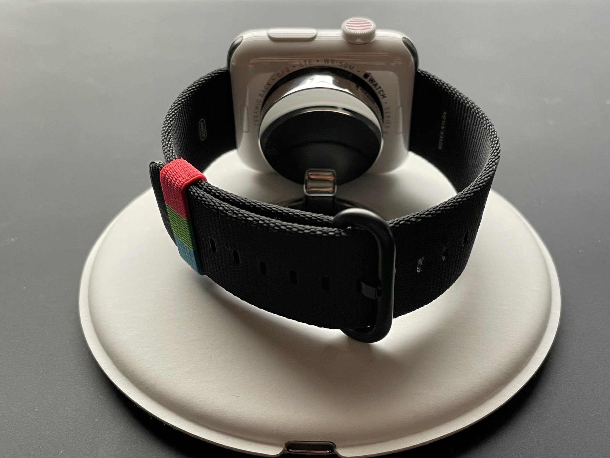 It came in white and gray, there hasn't ever been a black. It came with a unique band with a matching ceramic pin and contrast inside colour (that can't be seen when wearing it), and the fancy Apple charging dock that is available separately for too much money.