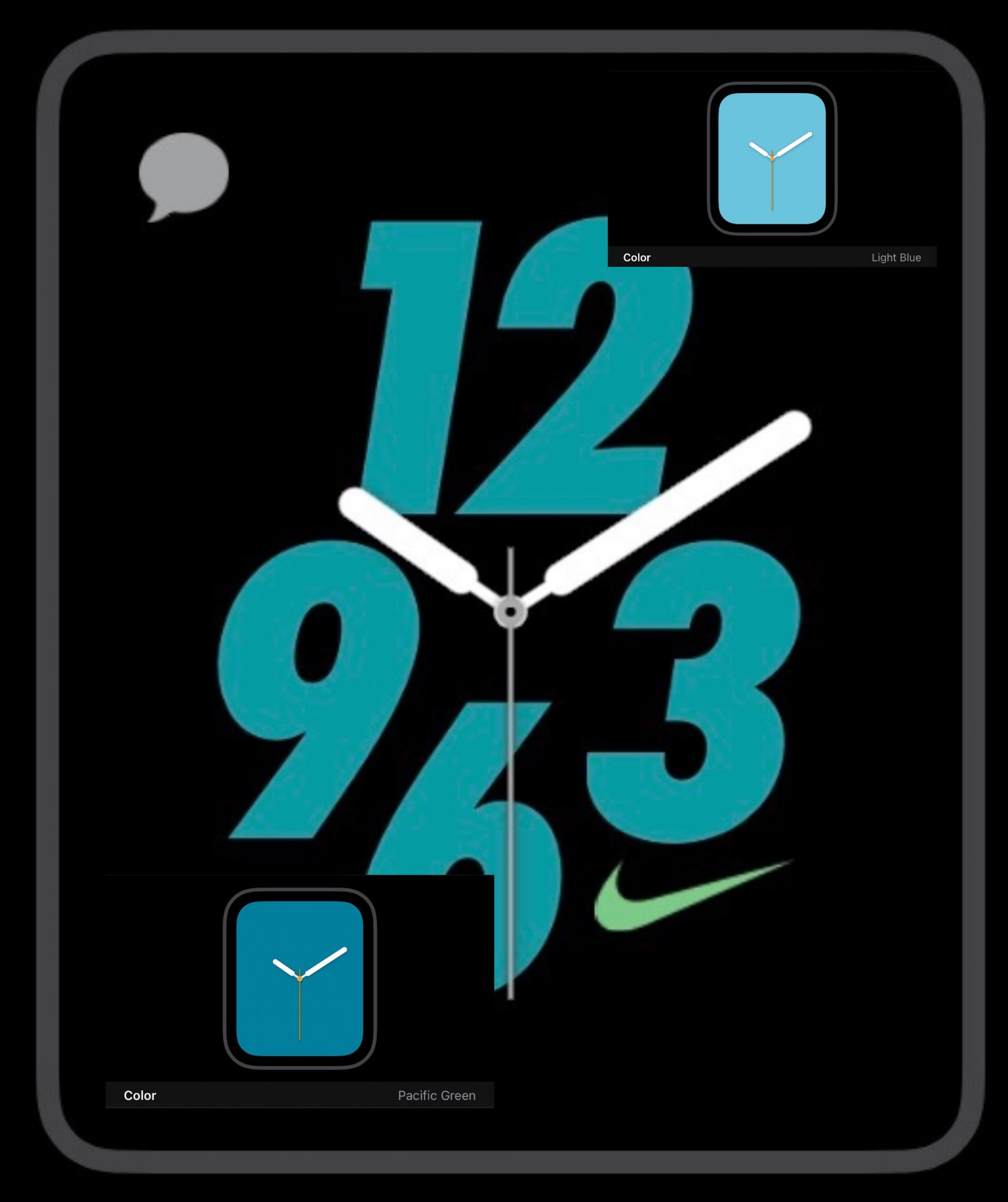Pacific Green/Spearmint. Of course Pacific Green is a little darker but matches the hue better than Blue and Light Blue.Anyone found a good match for a face colour for Chlorine Blue/Green Glow on a non-Nike watch? Sea Foam seems close but not sure really