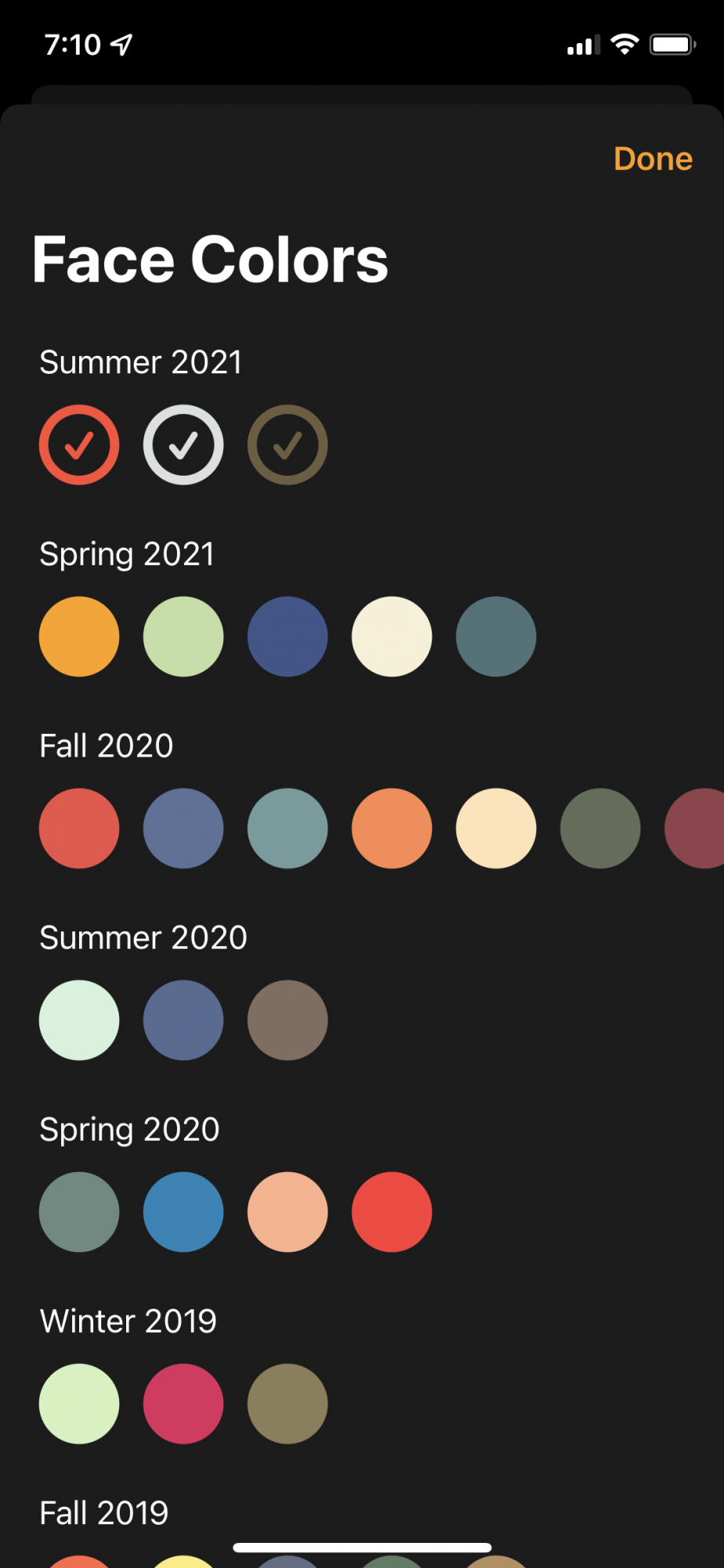 Well that's a terrible design change. A bit surprising coming from Apple since design and ease of use seems to be one of their main factors. Even though I have 100+ bands I rarely know what season they are in, I just scroll through the colors looking for whatever matches the best. Separating shades of the same color into different groups is one of the most idiotic design decisions I've ever seen.So in watchOS 8, Apple only shows a few color choices by default on the main color picker. At the end of the options is a + button to add more color choices. That + button takes you to the screen with all the colors sorted by season. I’m assuming Apple did this because the color wheel had gotten quite long with 6 years of band releases now in the books.