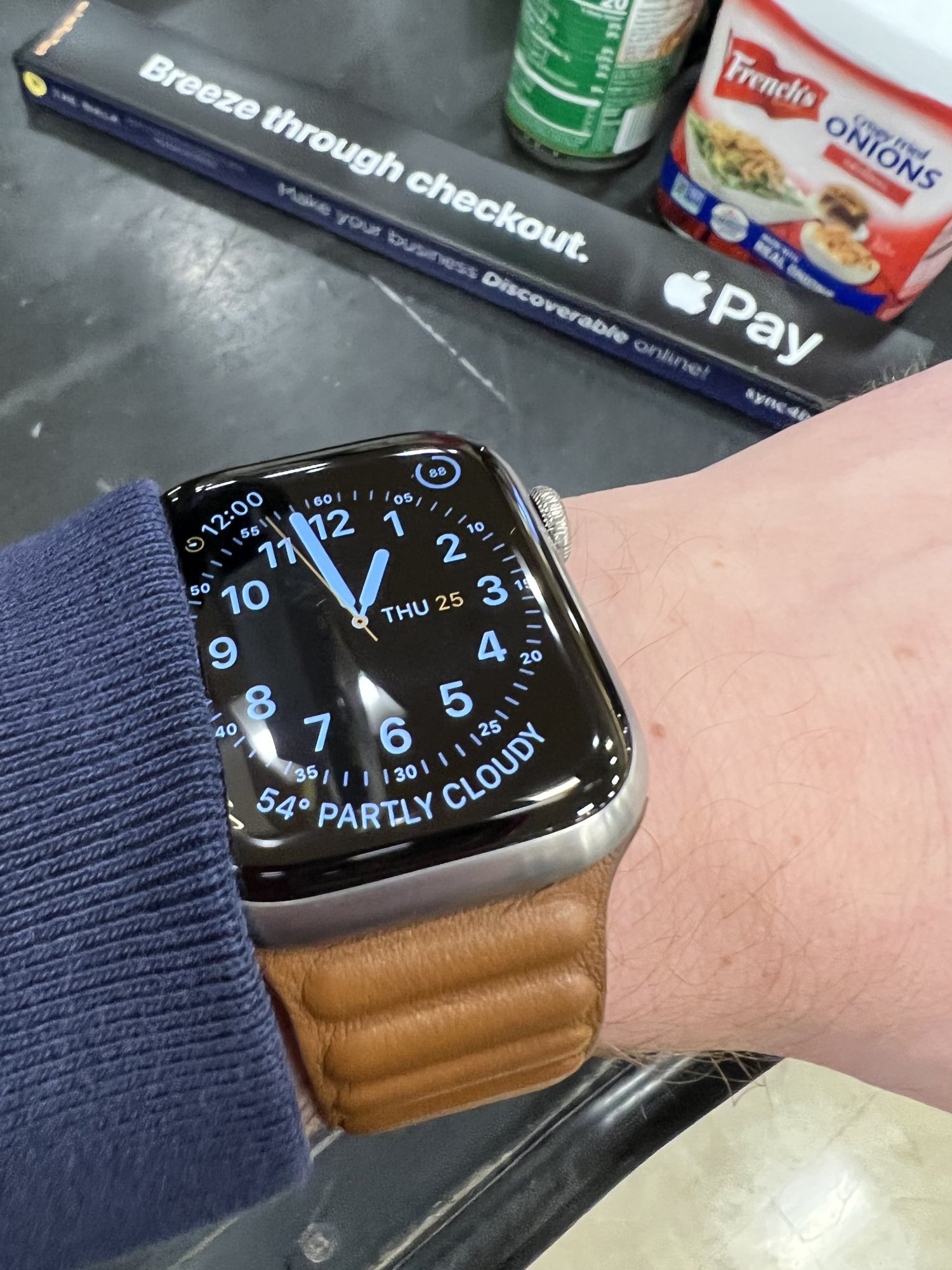 I bet I know what you served for appetizerNatural Titanium with Saddle Brown leather link and last minute Thanksgiving things in supermarket lightingAnd yes, did breeze through with Apple Pay!