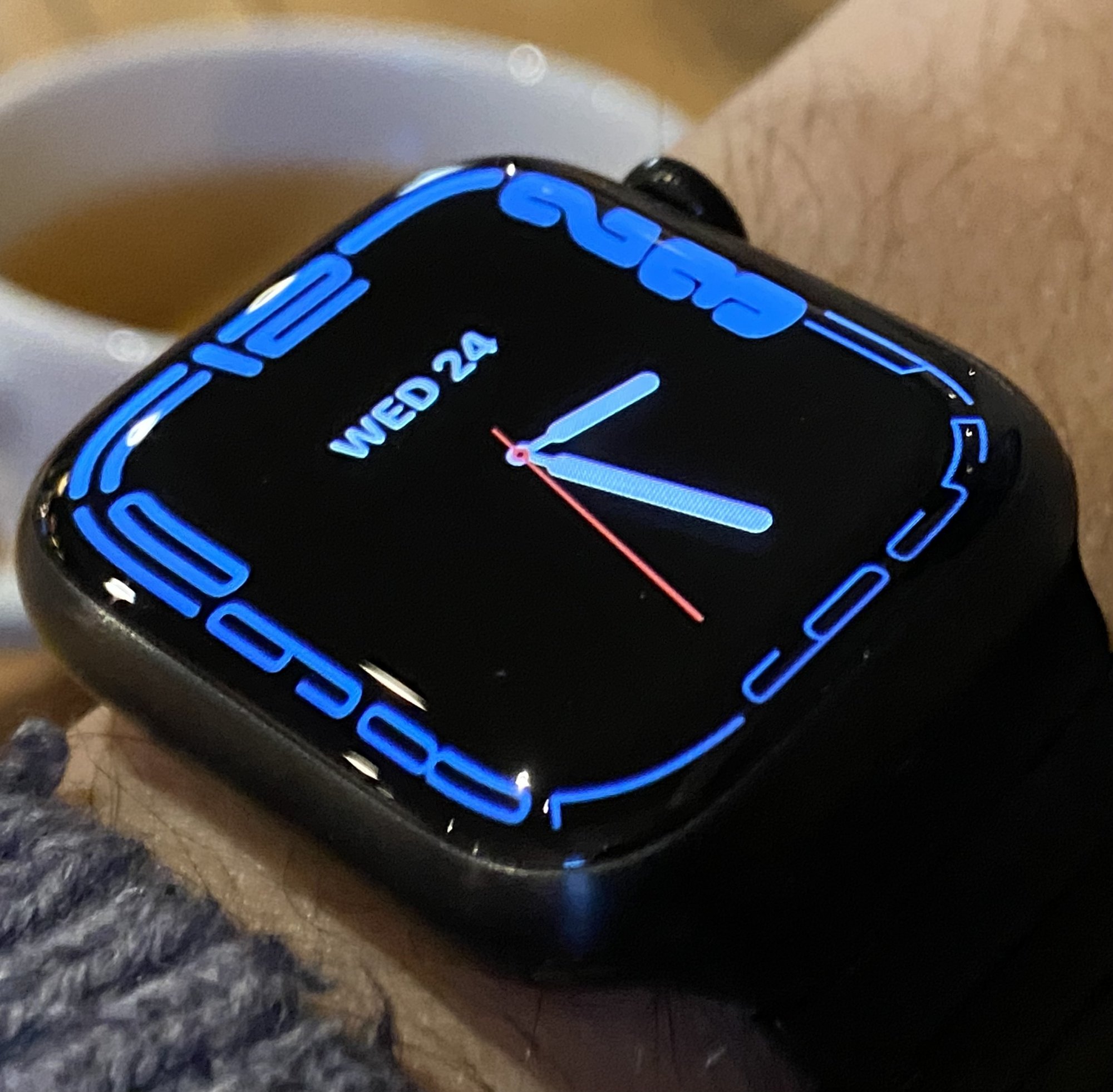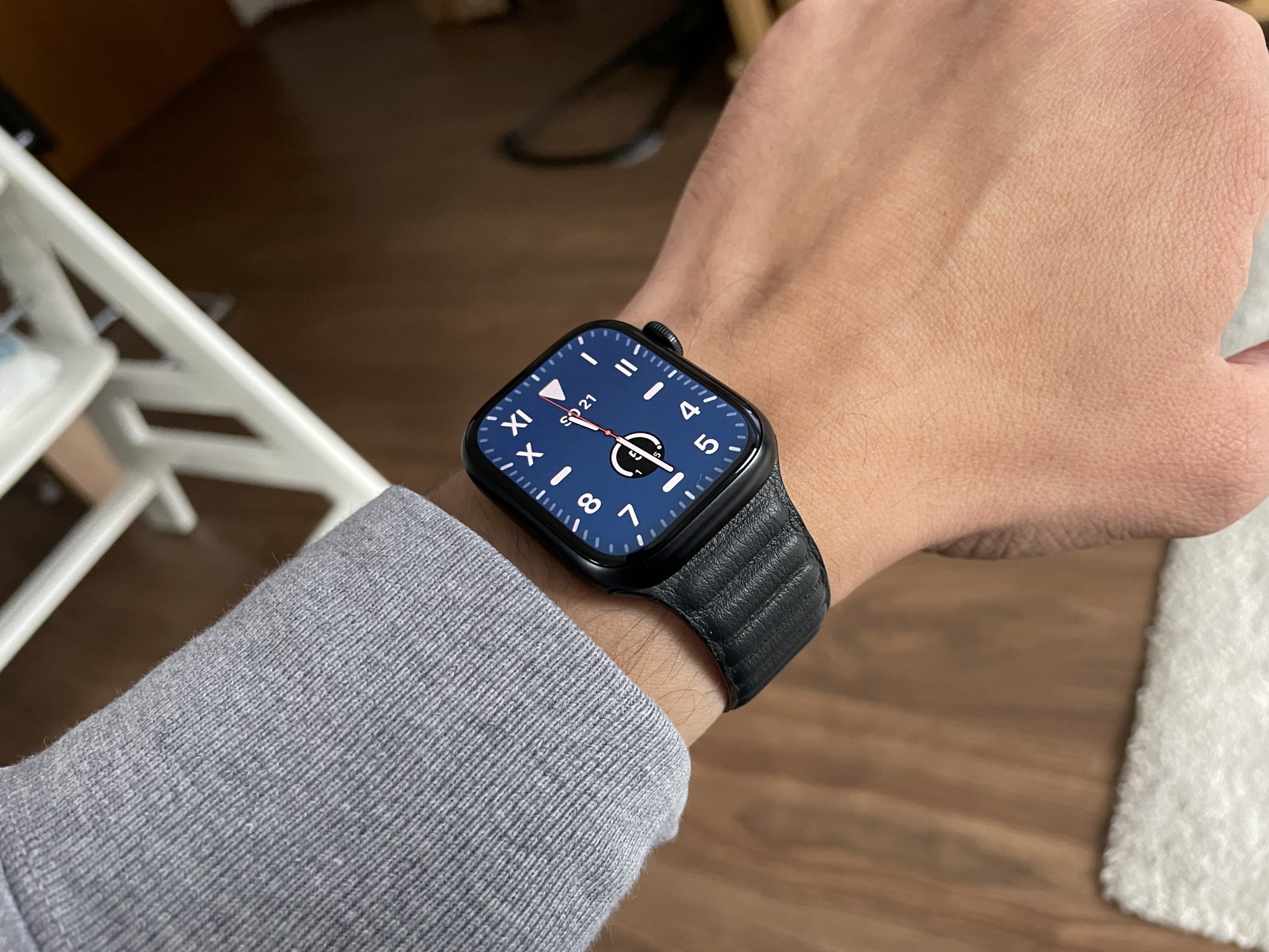 I feel that the starlight is still a “dull” finish, but I assume that’s just the nature of anodized aluminum. I wish it was a little shinier, but at least the warmer color gives the impression of some pearliness. And I think the ambient lighting really affects how it looks. The overhead lights at my Apple store are bright cool white, so the starlight watches on display look very silver. My lighting at home is all 2700 Kelvin, so under them the starlight’s warmth comes out. In bright outdoor sunlight, it’s more silver. Right now I’m sitting at my kitchen table on a mostly overcast day and in the natural light coming through the windows, the starlight looks warm again. It’s just lovely and I am so happy with it. I take back the bad things I said about starlight right after the Apple event.Disagree. There is so much black and so little blue in Midnight, it basically goes with everything … if you feel that black (like white) goes with anything, which many people do.