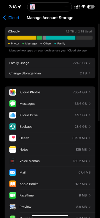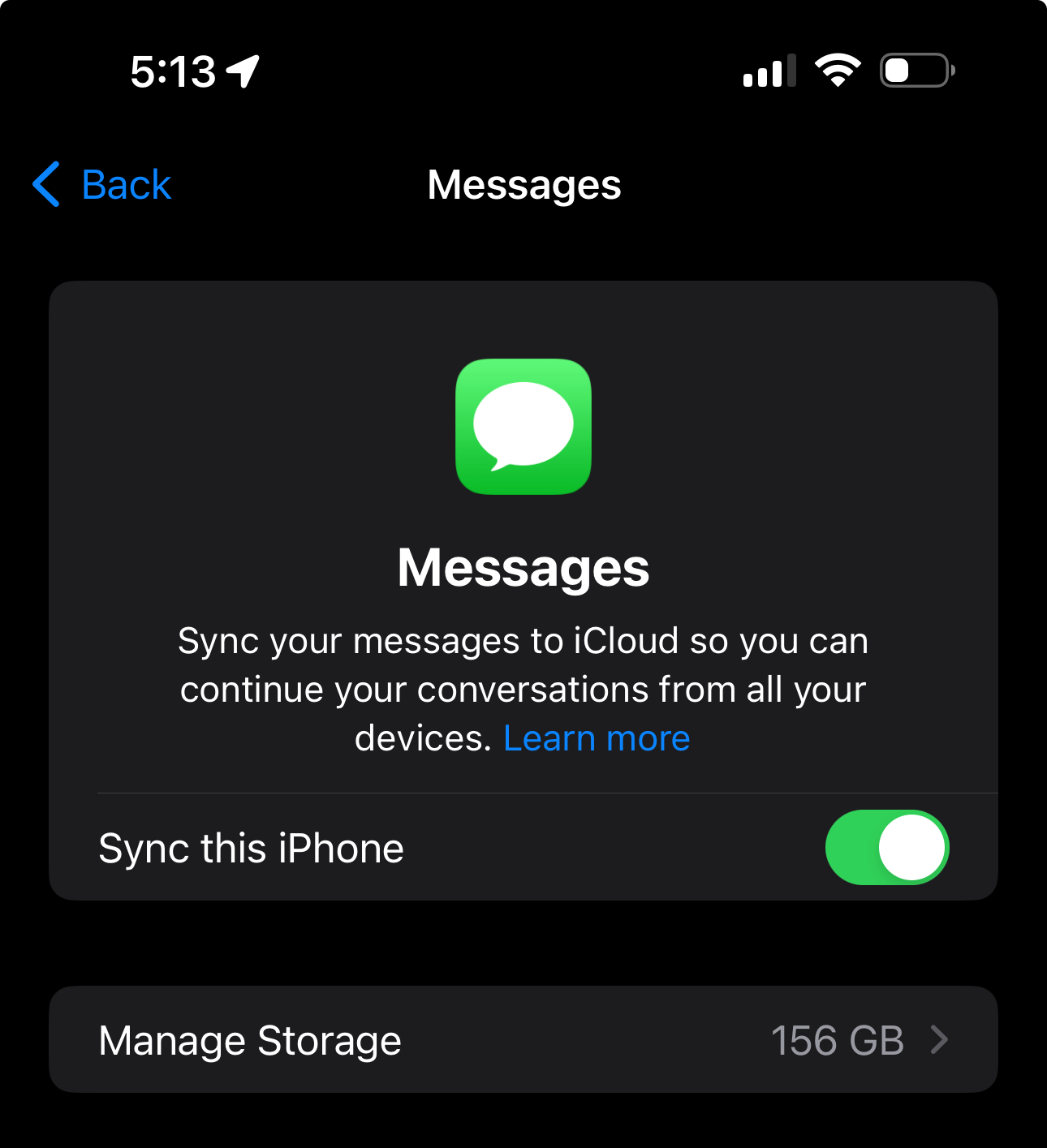 The "Messages" section in iCloud in the Settings app has been renamed to "Messages in iCloud." It shows the total amount of storage that messages are taking up, the number of messages synced to iCloud, and the time of the last sync. There's also a "Sync Now" option to force an update.