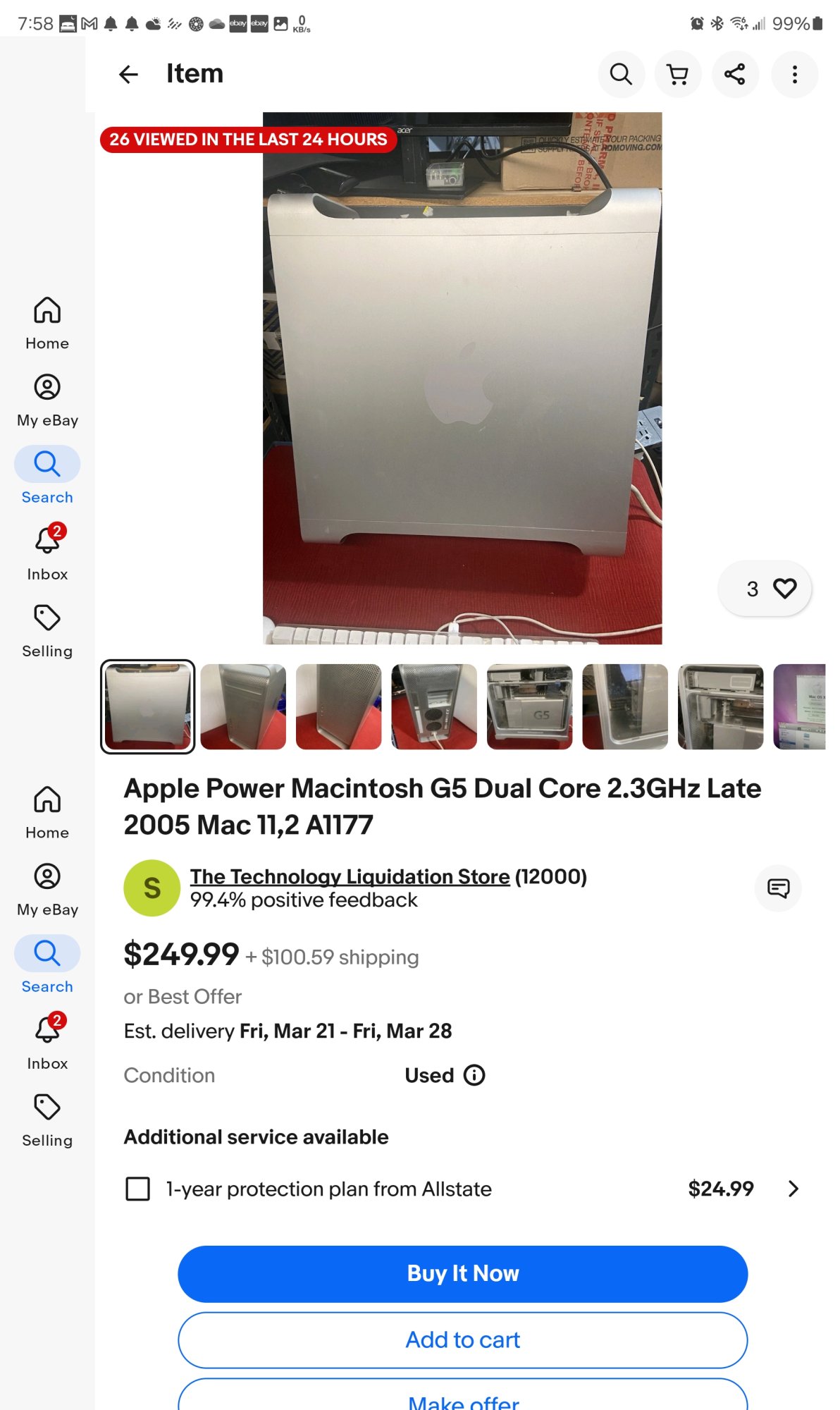 Are you looking for Power Mac G5 DP 2.3 GHz, late model 2005, for a reasonable price? You can find one right now on eBay. I saw it this AM and wanted to bring it to everyone's attention. See the attached listing. Essentially, $250 for the machine plus $100 shipping.