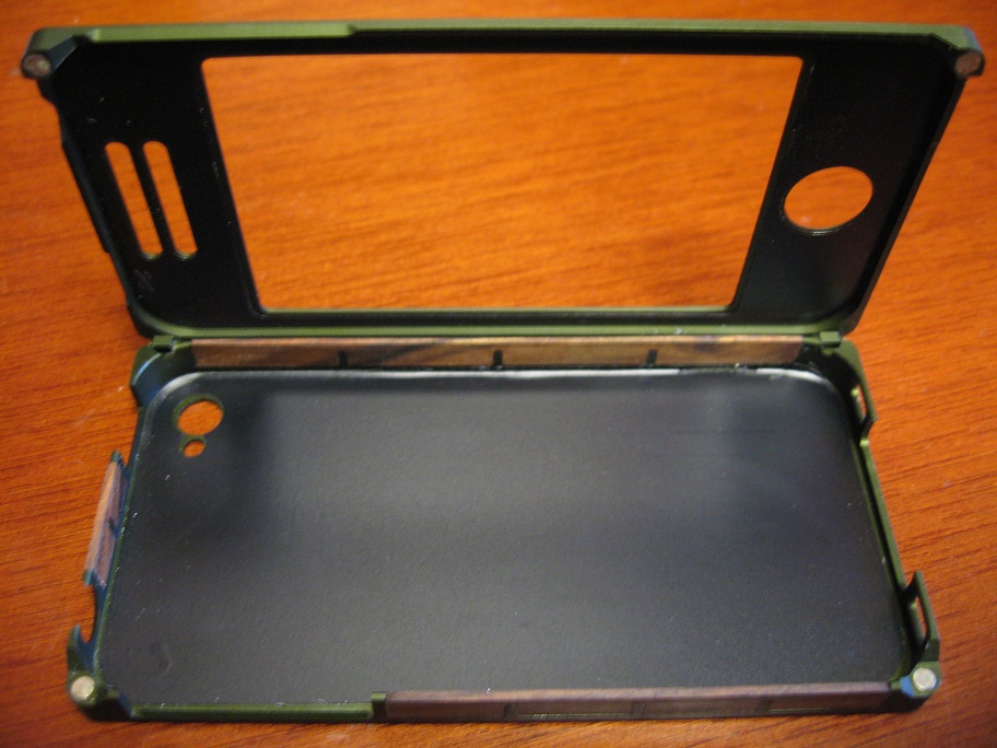 The anodizing is flawless. Consistent shade of deep green all around. The rosewood is a beautiful dark shade, and the joints between it and the aluminum are done really well. In the front, the case does come all the way to the edge of the screen all the way around, but due to the thinness of the material used, it doesn't really hamper typing at the edges of the screen (White/Rhino, I know this concerns you, like in the Seidio Rugged case). It can make dragging icons to different screens take just a bit more effort, but it's not hindering typing so far.