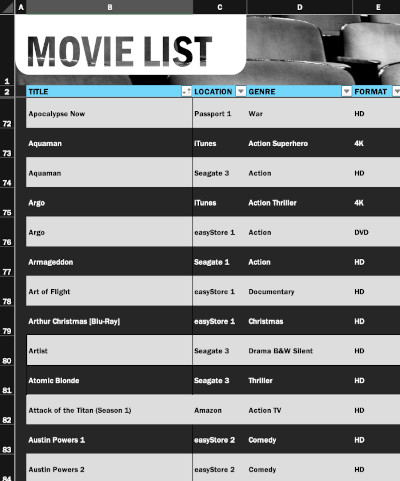 I have over 1,000 movies on 7 USB drives and use a media player to watch them. I installed Bootcamp and used DOS code to scan my drives and put folder names in a text file. After I got my large list, I pasted it in Excel and update the spreadsheet on the Cloud when I want to add/delete a movie. Also, organized it so that it lists the drive location and file format (HD, 4K, etc.), so I know what I have and where to find it.