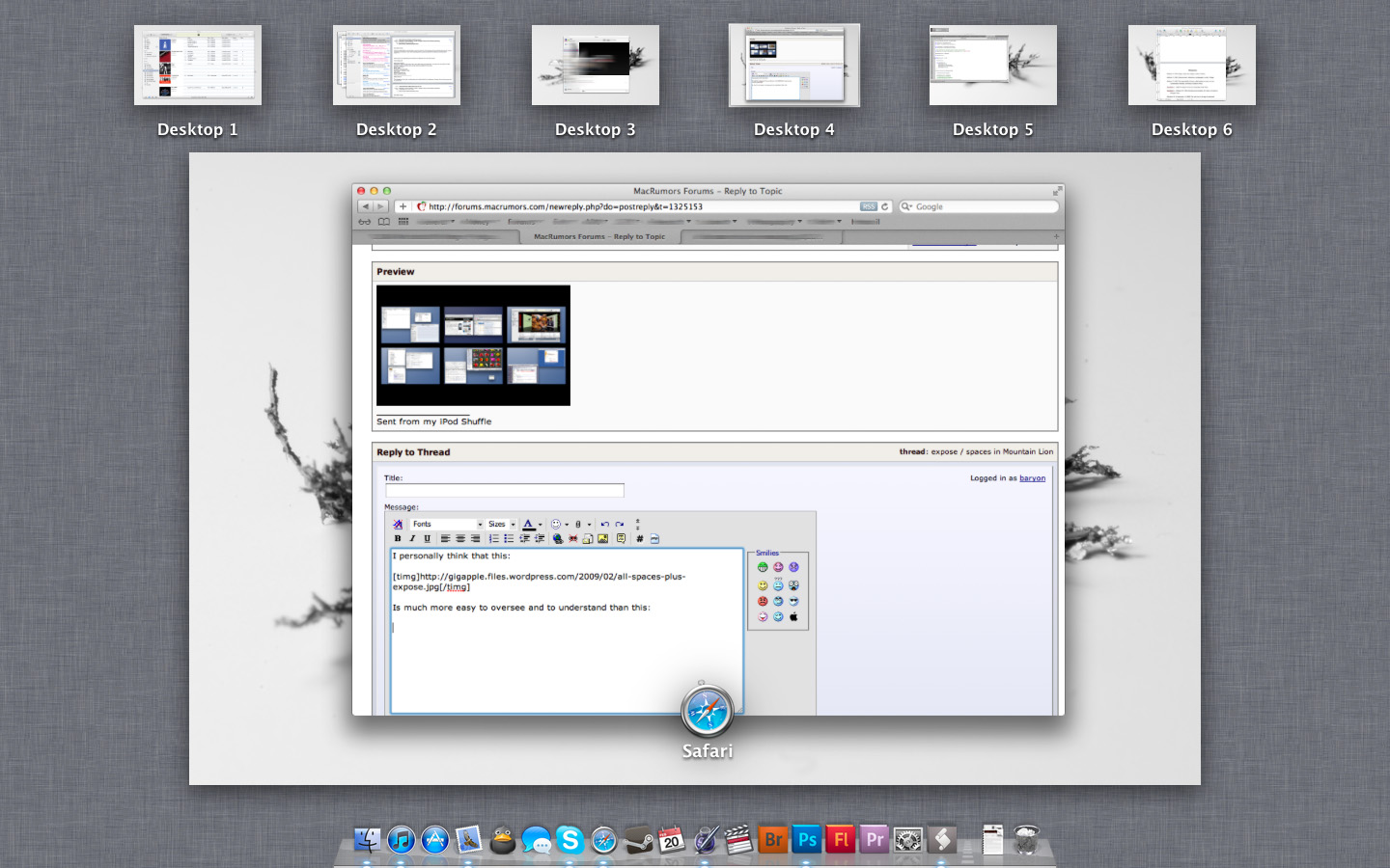 The only thing I like about Mission Control are the gestures. But why couldn't Apple just implement gestures to control Spaces? 3-finger swipe up/down/left/right to navigate between spaces, 4-fingers-up to enter Spaces Overview Mode (like top screenshot), and 4-fingers down to enter Exposé without entering Spaces. Why not?