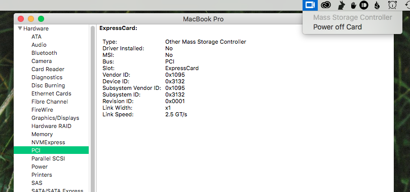 I plug my eSATA adaptor into the ExpressCard/34 Slot on my laptop and nothing happens. I do not believe it is the card's driver as I can still see the Silicon Image driver icon in the menu bar.