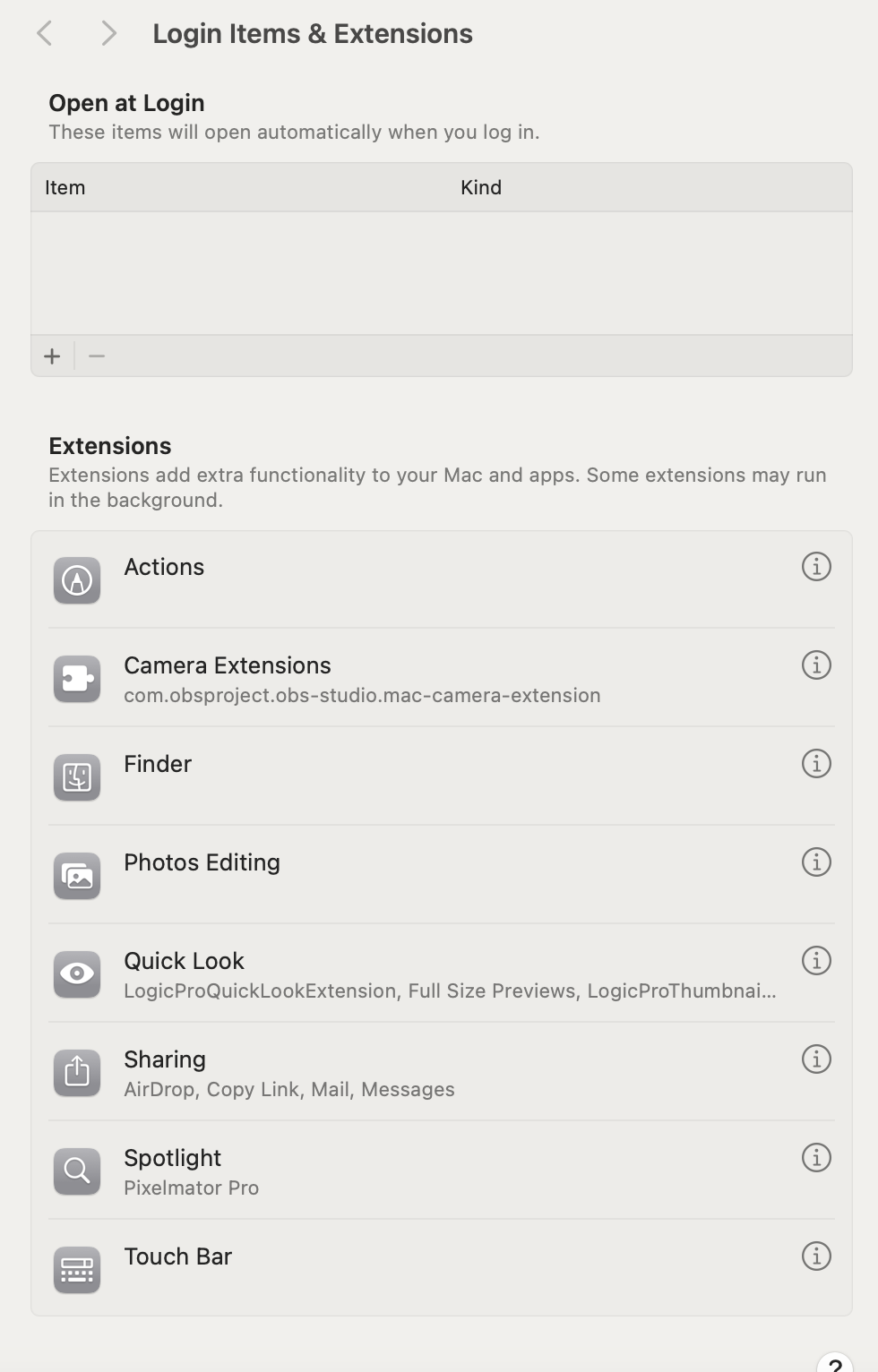 G galad macrumors 6502a Apr 22, 2022 789 865 Nov 23, 2024 #2 The panel is called Login Items & Extensions. Extensions are not login items, and will be used only when needed.