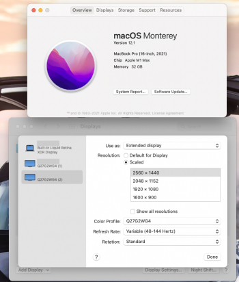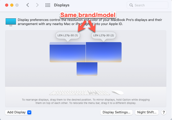 I am running 14" MBP with two external displays and the monitors will not keep their position to the left/right every time I wake from sleep or plug back in. The monitors are arranged above my MacBook Pro (see below), with the monitor on the left connected via a USB-C dock and hte monitor on the right via HDMI.