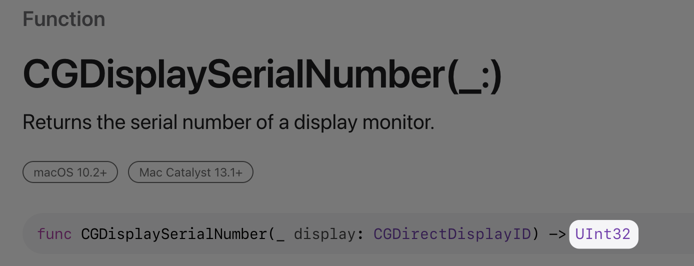 CGDisplaySerialNumber`, the serial number returned is the "bogus" one of "809585720". This is why I suggested in a previous post that it would appear that Apple should, at a minimum, update `CGDisplaySerialNumber` to be more intelligent and suss out the true serial number stored later in the EDID. Whether that would fix a low-level OS display issue is beyond my understanding. I'd guess not, but at least then programs like Luna and displayplacer could query useful information to help accurately place displays. I don't know what calls Luna makes, but I know for sure that displayplacer calls `CGDisplaySerialNumber` directly; I've checked the source code.