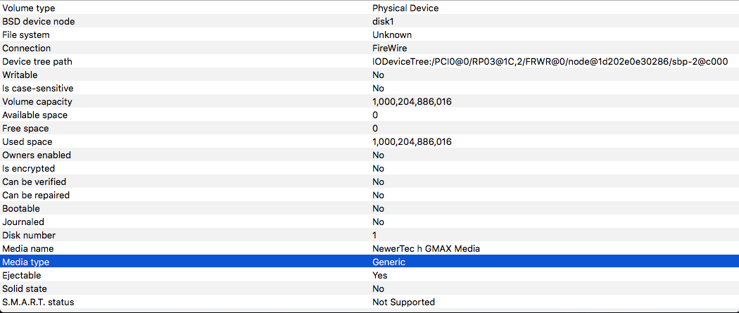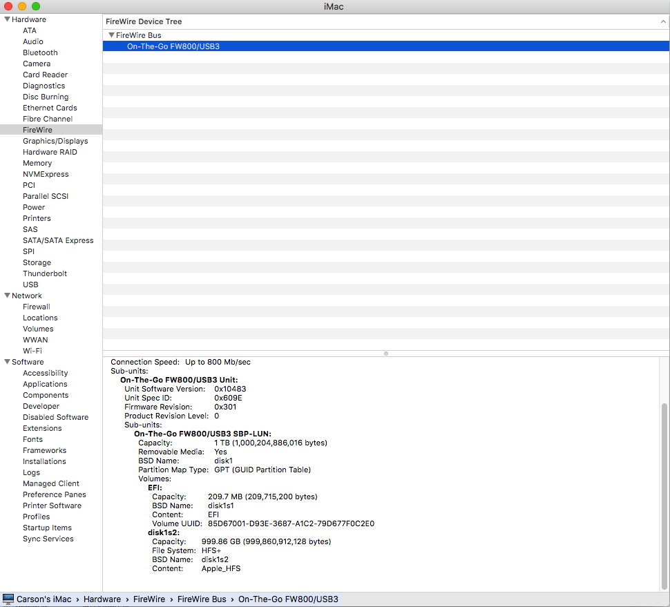 My FW800 1TB OWC external drive suddenly stopped working on my iMac. The drive won't mount and may have gone RAW? as it states that it simultaneously has 0 bytes available and 0 bytes used when viewed in system information (it shows in the FW bus in system info found in second picture). The drive spins up fine and hasn't shown any major signs of dying although I have used it consistently for 3 years. Below is the only info I could get from Disk Utility: