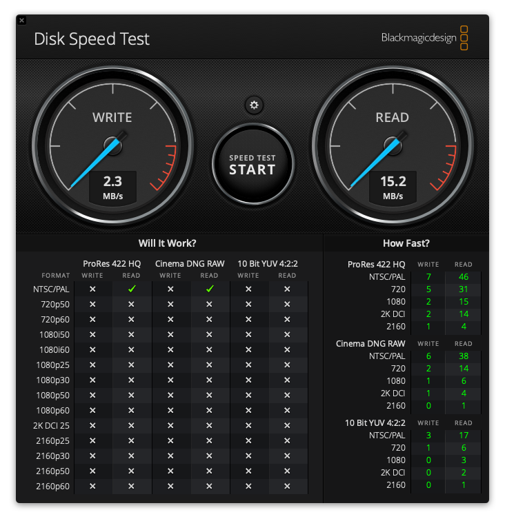 I just learned about Blackmagic Disk Speed Test and downloaded it to test the speed. First part of question: for anyone who is familiar with this tool, about how long does it need to run to give an accurate reading of the drive? I've been running it about 20 minutes, not sure if that's long enough.