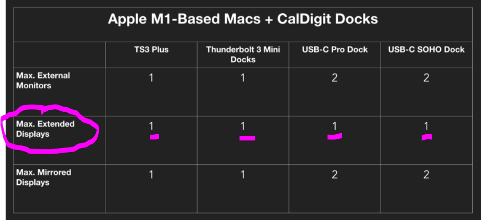 Anyone have the CalDigit Pro dock? The chart in this pages seems to imply it can use 2 external extended displays, unless I’m reading it wrong.