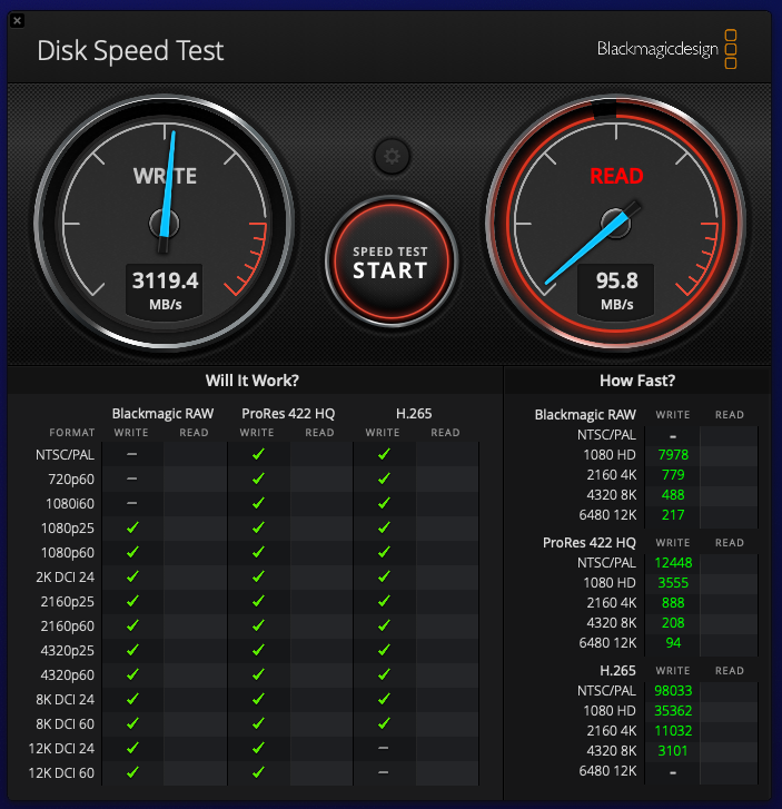 My Blackmagic speed test results are below. It'll report these speeds consistently.